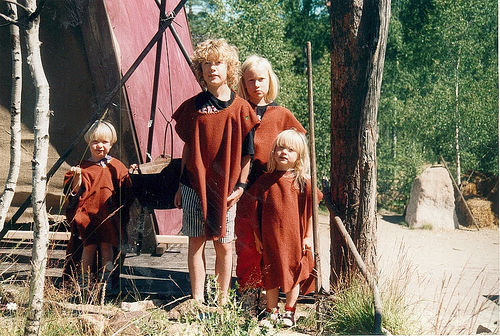 Så gjør vi så når vi hentar vårt barn, hentar vårt barn… Sidan me ikkje har fått lasta opp bileta me tok på folkehøgskulen, så hiv eg opp eit bilete frå den gongen dei verkeleg var barn som måtte hentast heim med jamne mellomrom, Sunniva, den yngste av jentene mykje oftare enn dei andre, fordi ho allereie frå ho lærte seg å gå aleine elska fridomen, og stakk av så fort ho såg ein sjanse til det for å oppleva livet på eiga hand. Det er ikkje få timar me har brukt på å leita etter henne, det vere seg i nærområdet, i Liseberg, i Tivoli i København og i Disneyland. Biletet over er frå Vikingland ein gong på nittitalet, og foreløpig er ho godt fornøgd med å halda seg til resten av flokken der ho kikkar fram under ein alt for lang pannelugg. I motsetnad til storesystera like bak, så ser ho ut til å trivast med at alle måtte ha «vikingkostyme» for å få vera i parken.