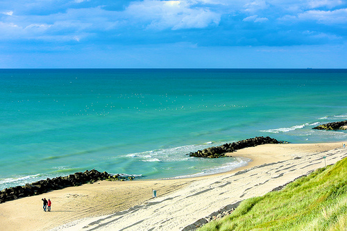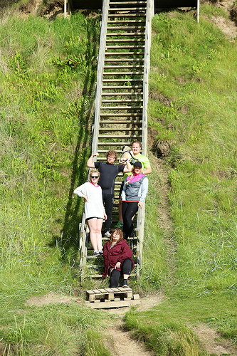 Første steget var å koma seg ned klitten til stranda via ei bratt trapp, som i grunnen var grunn nok i seg sjølv til ikkje å delta. Var det ikkje farleg mykje erosjon kring festebjelkane, og såg ikkje nokre av trinna ganske skrøpelege ut? Men kva gjer ein ikkje for familien sin? På biletet ser me bare nedste del av trappa, bare for å understrekja at ho er både lang og bratt.