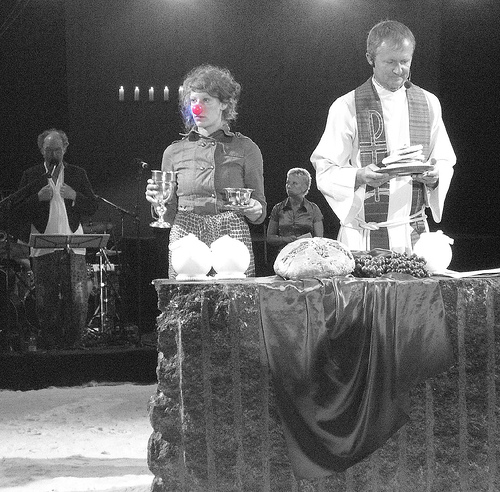 Veret i dag har vore sommarleg. Ein pause på terrassen med sol på ryggen og ei god bok gjorde godt. I kveld vart det ein tur langs stranda med kjærasten min og Oscar. Då hadde havskodda sige innover landet og det kvite mørket vart så vått og tett at eg måtte av med brillene for å kunna sjå nokonlunde klart. Over helga reiser me på korsveifestival. Det ser eg fram til. BIletet over er frå ei ekte korsveimesse med klovn og prest og altar i eit sirkustelt. Den store aktiviteten i dag har vore rydding og rydding. Arbeidsromet begynner å koma i orden, det viser bare ikkje på overflata endå. Noko av det verkeleg fine i dag er at eg har funne mange handskrivne dikt og ein del av dei er eg rett og slett ganske fornøgd med. Eg er litt overraska over meg sjølv kor mykje eg har liggjande av slike ting fordi eg lever travle dagar frå hand til munn og ikkje når å gjera noko meir med ein del av det eg skriv.