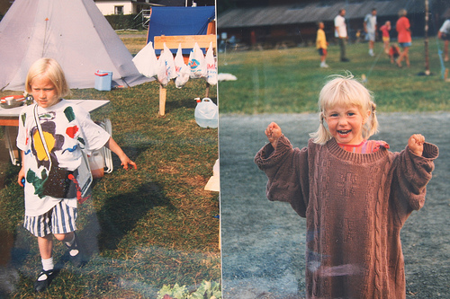 Om mindre om eit døgn pakkar me telt og madrassar og set oss i bilen for å køyra til Seljord på Korsveifestival. Biletet over er frå ein festival for seksten eller sytten år sidan, så dette har me vore med på før. Så godt som kvar einaste festival har me fått med oss, og dei aller fleste gongene har me vore der med heile familien. Minnene frå desse festivalane trur eg står ganske høgt oppe for oss alle når det gjeld fine ting me har opplevd saman. Nå reiser me vaksne aleine, og er spente og forvntningsfulle framfor ei veke i telt med mange impulsar som eg trur blir verkeleg fine å bera med seg vidare. Nå er det dagen for pakking og rigging og ferdigstilling av diverse. Eg har akkurat fått montert ein babyjakke eg har strikka og skal ha med meg austover. Jakken er laga av eit veldig eksklusivt garn, silke og babyalpakka. Desverre var det ikkje det lettaste garnet å strikka fint og jamnt med. Nå har jakken fått seg eit bad i lunka milovatn, og ligg i press mellom tørre handkle, eg håpar det skal gjera susen for å få jamna ut strikkinga litt. Etterpå skal eg ut og kjøpa fine knappar til å ha i han. I følge yr.no renar det ikkje, og skal heller ikkje regna før i kveld. Det stemde ikkje heilt med det verkelege livet då eg gjekk ut for å henga ut den siste klesvasken, så det vart opphenging inne i staden.