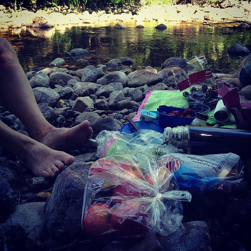 «I SKUGGEN??? » spurde eg sjokkert. Eg som kom frå vestsida av fjella, hadde sett så lite av sola at det kjendest natusrtridig å skugga unna. Men begge venninnene mine var heilag overbeviste om at nettopp skuggen var det einaste fornuftige, så då måtte eg gje meg. Det neste kriteriet var at det burde vera ein sval plass. Torun hadde snakka med ei som sa at det var nokre fine plassar langs elvebredden, eller kanskje det var rettare å seia «bekkebredden», for elva langs Dyrskuplassen var det mest ikkje vatn i. Me fann ut at for å finna den aller beste plassen, så var det lurt å vassa over til den andre sida. Med så lite vatn som det var i elva, så var det heilt greitt, sjølv om nokre av steinane var nokså sleipe å gå på. Eg måtte innrømma at livet på skuggesida med beina dyppa i kjøleg vatn, var ganske paradisisk. Torun diska opp med ost og knekkebrød, med vaniljeyoghurt, moreller, jordbær, varmt vatn på termos og pulverkaffi. Kjærasten min kom etterkvart med ferske bollar og ein dunk med drikkevatn. Eiit fargerikt badehandkle vart picnicduk. Biletet gjer ikkje full rettferd til situasjonen. Det heile var endå meir idyllisk enn det ser ut til å vera.