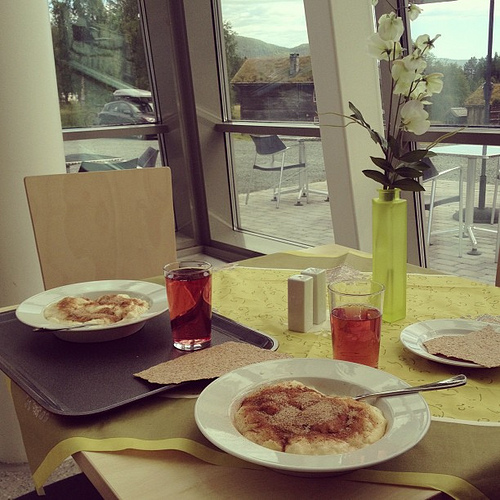 Utpå ettermiddagen same dagen, ankom me Vest-Telemark folkemuseum, der dei hadde ein restaurant med tradisjonell norsk mat. Me kom der tre minutt før stengetid, og det var eigentleg slutt på servering av varm mat, men sidan dei framleis hadde ei gryte med det dei lokalt kallar varm rjomegraut, så fekk me lov til å kjøpa det. Det var akkurat det me hadde lyst på, så me var glade, svoltne og takknemlege. Flatbrødet var ein slags heimebakt variant, bakt på veldig grovt mjøl, og safta smakte rips.