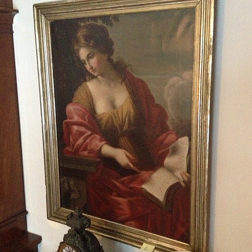 Ho er ein vakker kopi av eit veldig berømt maleri, og er malt i Europa ein stad på 1700-t. Ho hang over spisestuebordet til svigerforeldra mine, og nå har Ingrid arva henne. Ein stad er det eit bittelite hol i lerretet, gullmalinga på ramma er skalla litt av her og der, og ramma sit litt, laust, men elles er ho i god stand. Ho tek ganske stor plass på veggen, og akkurat nå har Ingrid ingen plass å plassera henne. Akkurat nå er dette og nokre andre arva maleri på vandring rundt i heimen, fordi eg strever litt med å finna ein plass på veggen der dei kjem heilt til sin rett. Eg har og arva eit portrett av ei admiralinne, som må vera tipp-tipp-tipp-oldemor til Leif eller noko slikt. Ho har svart kjole, stor kyse og eit ganske bestemt blått blikk. Ingen må misforstå meg, eg er kjempeglad for desse bileta, det er bare ein kabal å få det til å bli slik eg vil ha det. Likevel liker eg blandingen av gamle arva ting, litografiar eg sjølv har kjøpt, arvemaleri, bilete Ingrid har malt og ikeamøbler.