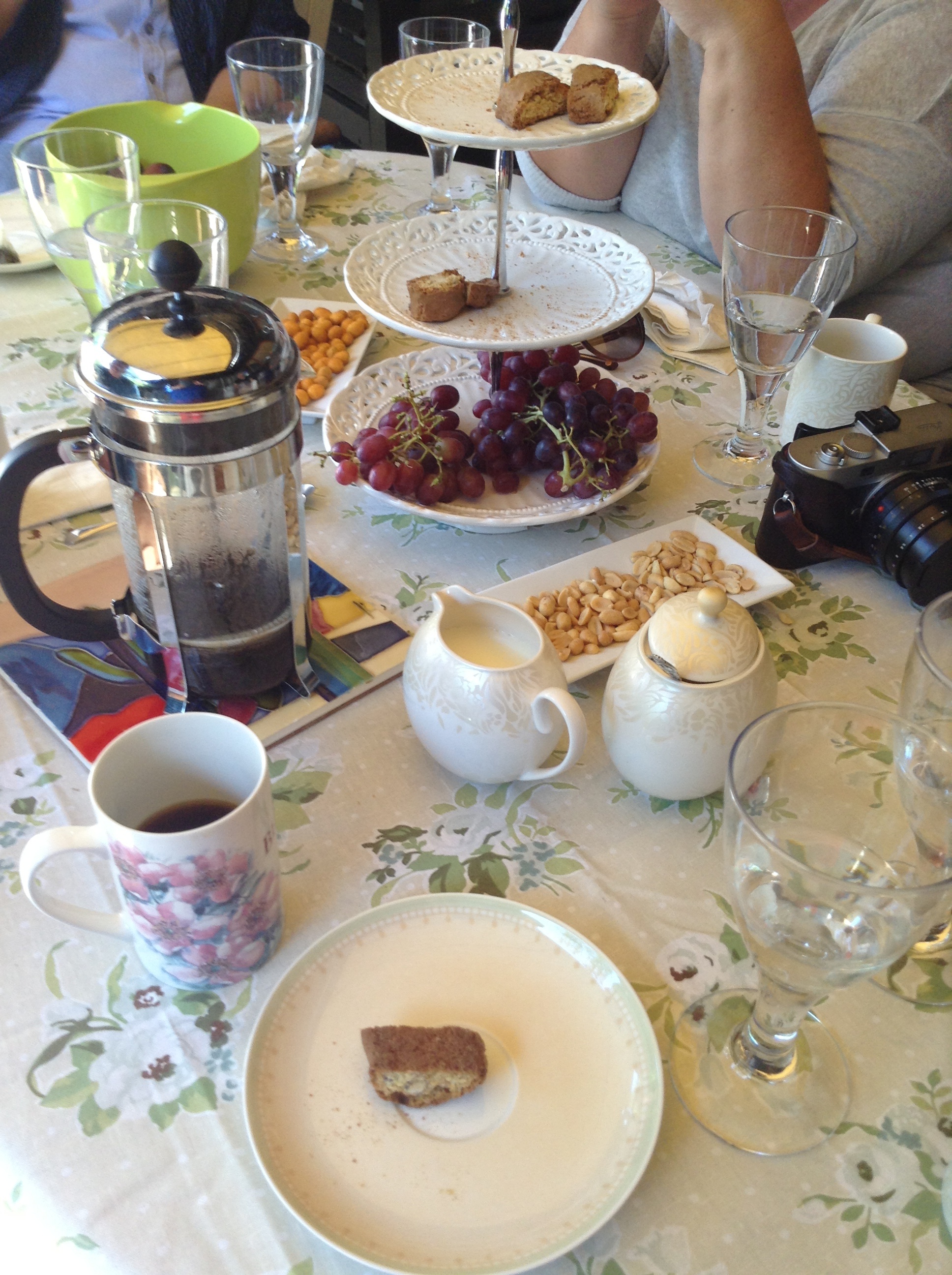 Me rakk og familielunsj i hagen til svigermor og svigerfar, som nå er blitt hagen til Astrid og Einar. Den varmrøykte laksen frå i går smakte like nydeleg som i går, og etterpå var det kaffi, druer og biscotti saman med plommer frå hagen i Kirkeveien. Det er ikkje ofte me er samla med alle brørne til Leif og alle svigerinnene i Bærum. I fjor sommar levde begge foreldra og. Det kjennest som ein ny epoke er starta. Biletet øverst på denne posten er frå lunsjbordet i føremiddag.