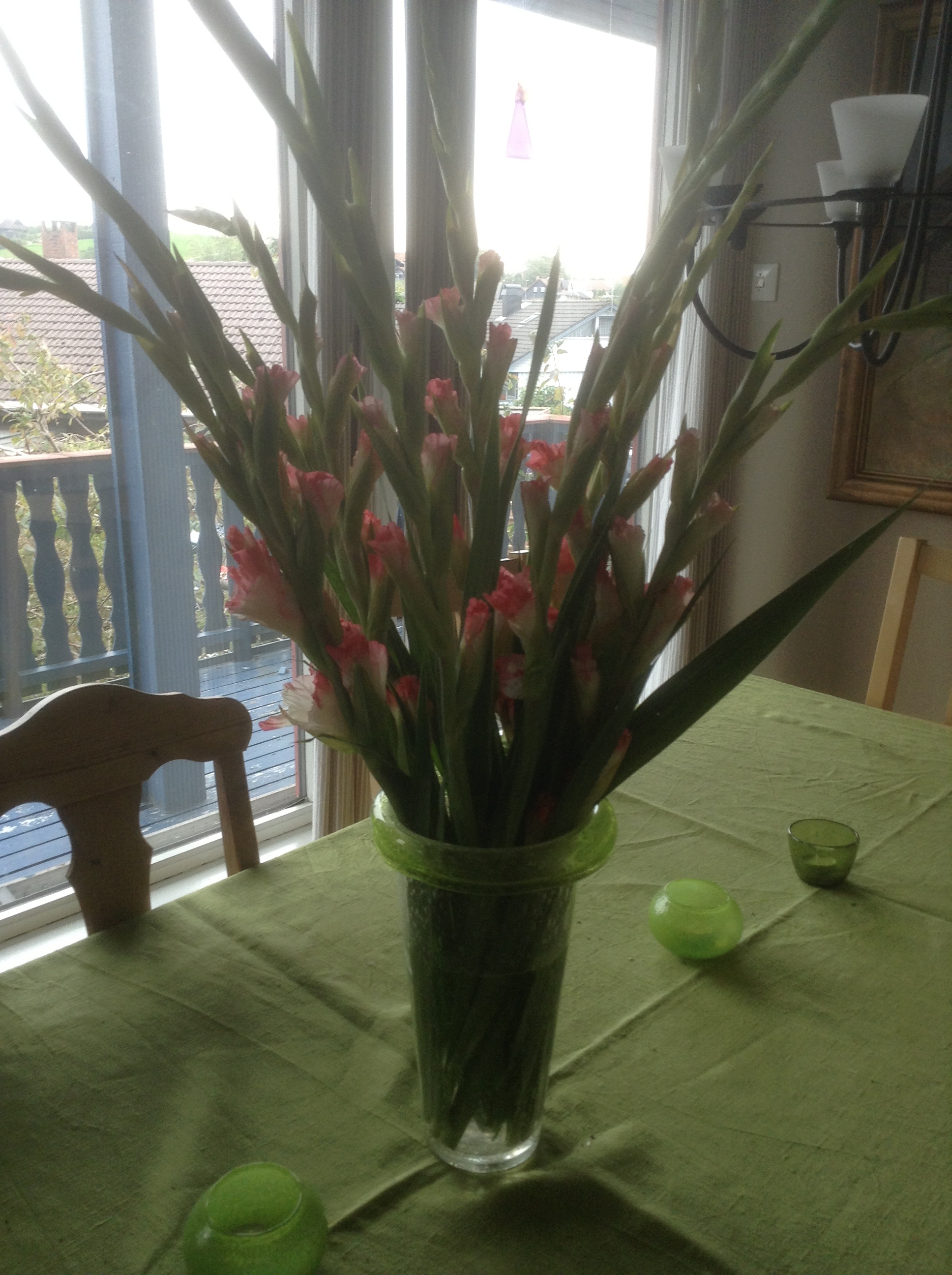 Nå skal eg via meg til vaffelrøra. Sjå kor fint det blømer i vasen min, forresten. Eg kjøpte gladiolusane på Ikea på fredag, då hadde dei ikkje sprunge ut enno.