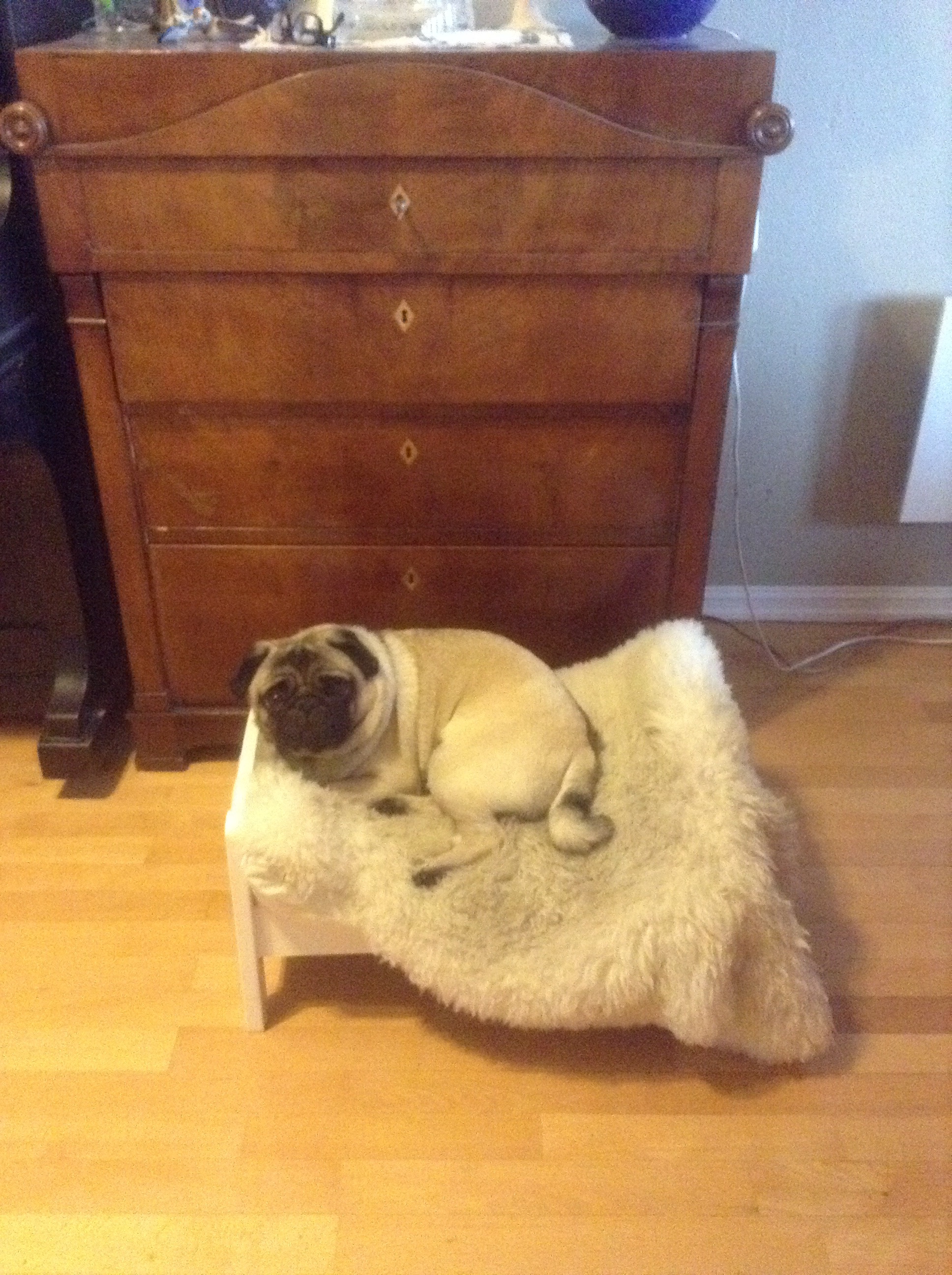 Kan vel faktisk vera eit dekkjande ord for omgjevnadane her og no. Det er framleis sundag føremiddag, og skrivetid i heimen. Eg skal opna kreative rom og leggja planar for bønevandringa i kyrkja i kveld. Oscar har vore ute og gått tur med mannen i huset, den siste på jomfrutur med pulsklokke. Om det tydar på ei slags ny og komande midtlivskrise er ikkje så godt å seia, men nye joggesko som ikkje er mine står på utstilling i stova. Dei er nøye utplukka gjennom studioarbeid og har usynleg påskrift i fire bokstavar d-y-r-e. Eg er dessverre ikkje smitta med tanken på kor fint det ville vera å kunna springa halvmaraton neste haust. Det er ikkje Oscar heller. Han ville aller helst inn igjen med det same, for han er ikkje så overbegeistra for heftig regn… Då er det kjekkare å vera på kjøkkenet å spela død eller bjeffa «I love you,» for å få godbit av meg. Når Oscar kjem på overnattingsbesøk har han med seg ei dokkeseng med saueskinnsfell oppi. Der søv han om nettene, og slappar av om dagen når han måtte føla for det… Han er her så pass ofte at det i grunnen ikkje gjer så stor forskjell å ha han som losjerande gjest. Heldigvis går hund og katt så pass godt overeins her i huset at me slepp å leggja arbeid ned i å forebyggja eventuelle samanstøyr. Det hender til og med at dei ligg på same fanget eller et av same skåla. Cleopatra er litt mindre, men totalt overlegen på dei fleste vis. Blir denne gjestande veslebroren for nærgåande hoppar ho bare opp i høgda. Ho spaserer med største sjølvfølge på mønene i nabolaget, medan Oscar må lokkast til å våga å gå opp trappa.