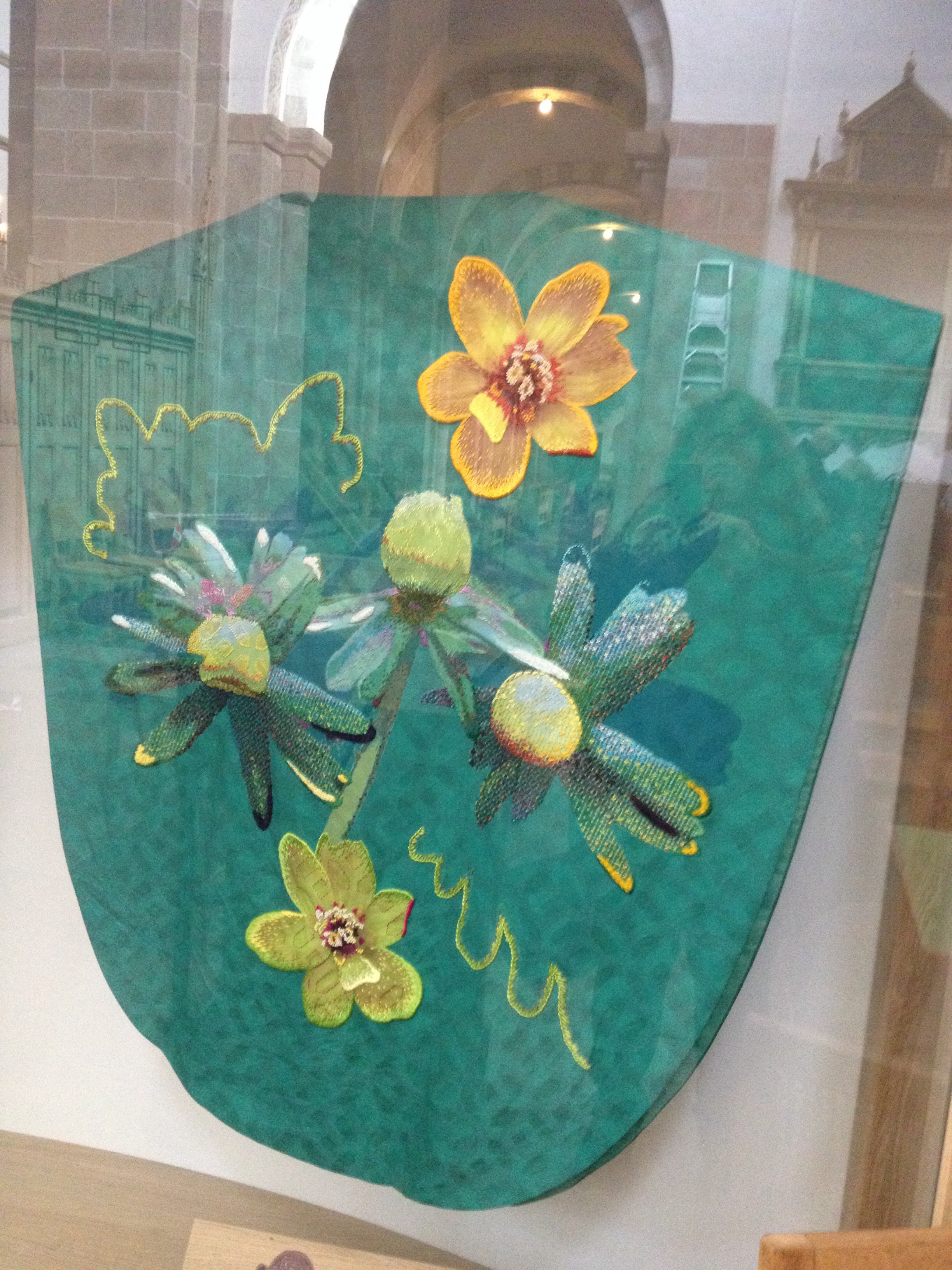 Messehaglane, som hang utstilde i kyrkja var og overraskande moderne utforma til bruk i ei kyrkje som vart bygd i mellomalderen. Her er den grøne.