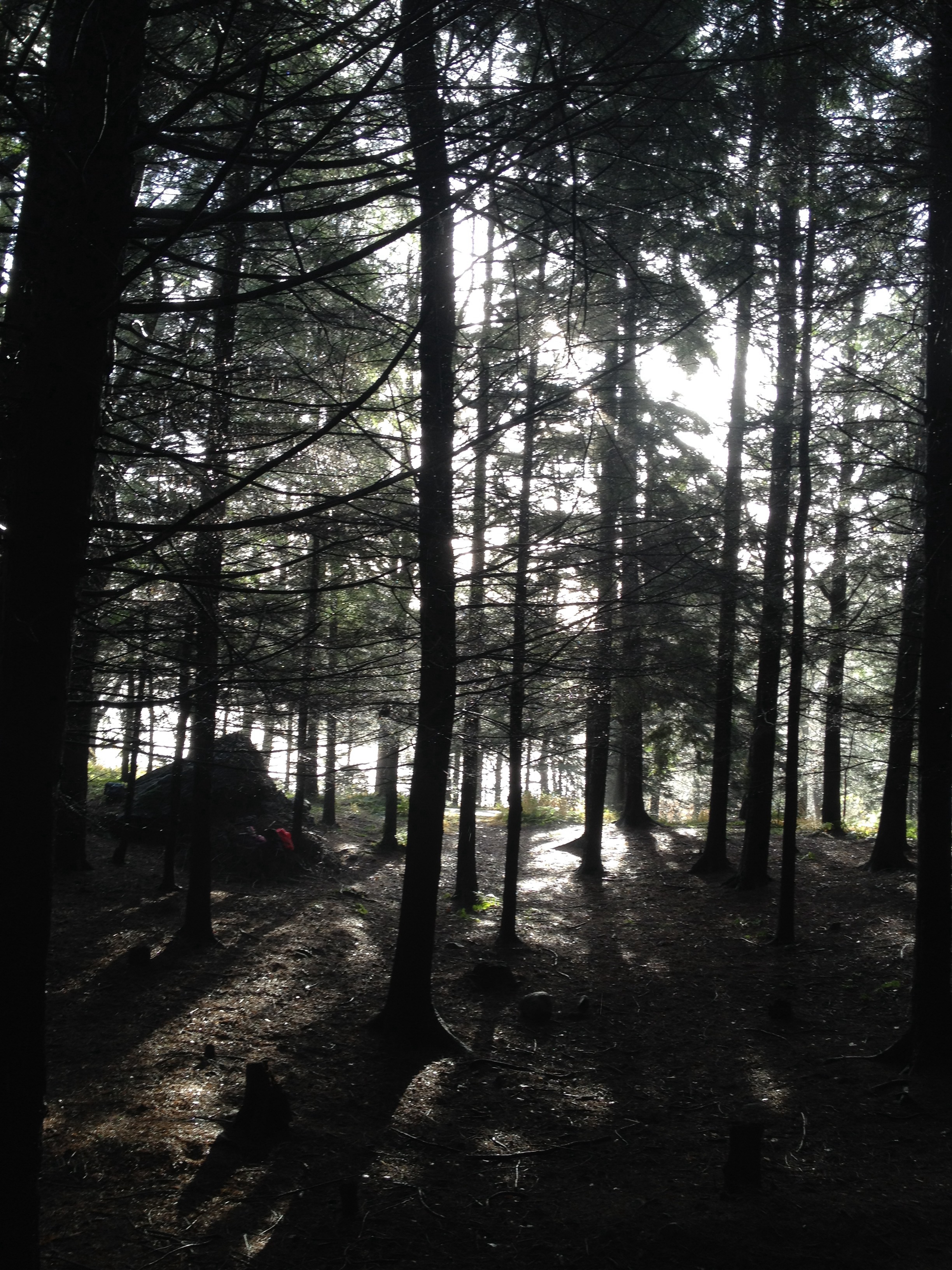 Dette biletet er teke i Sandtangen der me var på tur i dag. Me fekk med oss både regn, hagl og sol. Her inne i skogen hadde me pause medan store regndropar blanda seg med kaffi og kakao i koppane våre. Det gjeld å kle seg godt, og me lyser godt opp i skogen når me kjem på lange rekkjer med gule refleksvestar, fargeglade regnklede og rosa og gule regntrekk på ranslane.