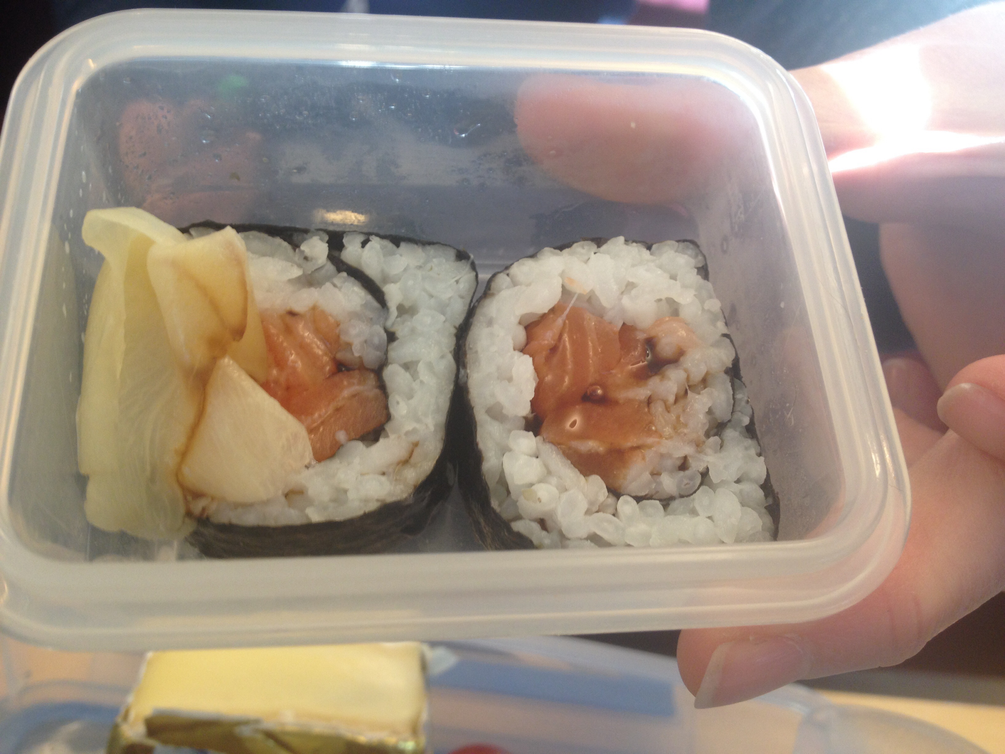 Og mest kvar einaste dag får me tid til matpause. Dei norske matpakkane har vore i rivande utvikling dei siste åra. Ungane stiller med små batteri av fargeglade boksar med diverse godsaker i. Dei har med alt frå blåbær til hjarteforma gulrotbitar og kalde karbonadar. Nokre av dei har fancy boksar som ser ut som små i-padar heilt til dei opnar dei og avslører diverse små rom med oppskoren mat. Me vaksne ligg ikkje langt etter, her er deler av Dagny sin lunsj i dag, små veltillaga sushibitar i ein liten boks før ho går laud på franske ostar i boksen under. Kva har skjedd med dei to kneippbrødskivene med henholdsvis kvit og brun ost?
