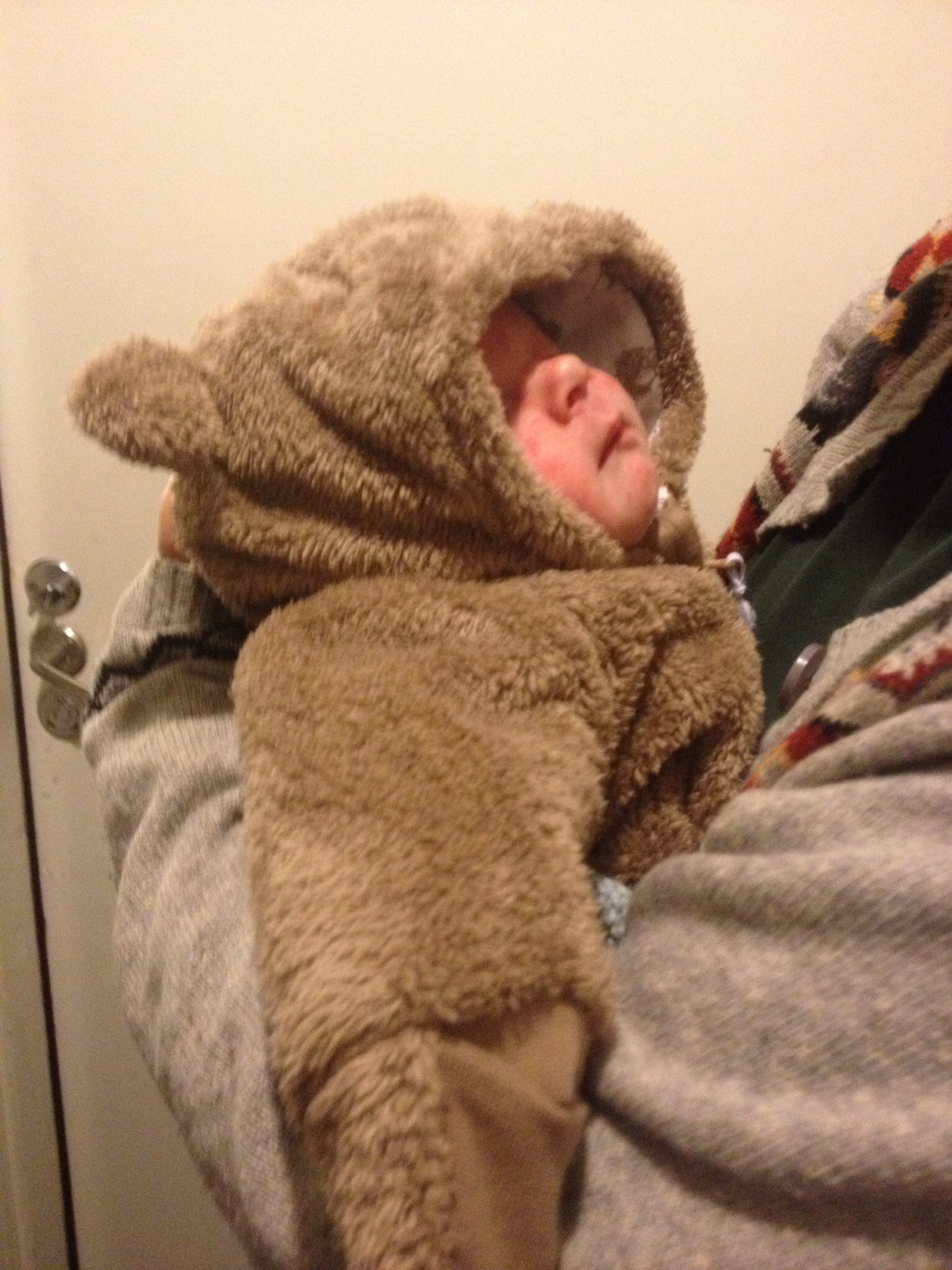 Og i dag har eg hatt fleire timar med ein nyfødd liten gut på fanget. Det var så utruleg fint å få helsa på han. Når nokon plasserer eit nyfødd menneske i armane mine, er eg nesten i himmelen… Lukka til med alt som skal skje deg, lille venn. Han ankom heimen i ein liten brun bjørnedress med øyrer på hetta og hale på rumpa, og var heilt til å eta opp.