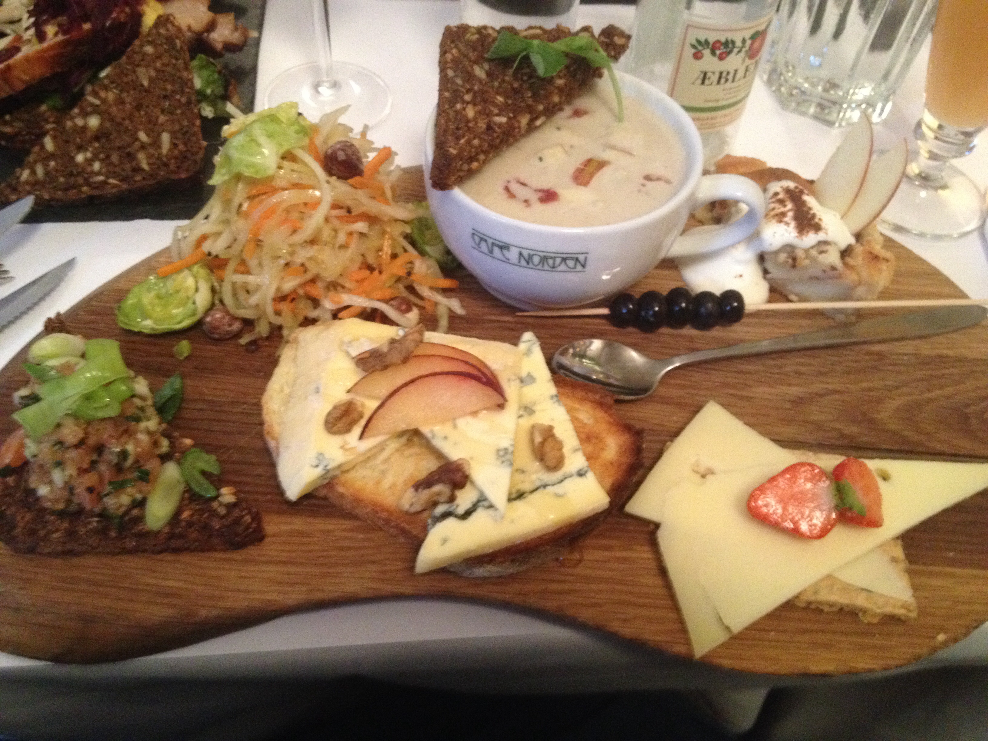 T tatt Sigrid kom etter oss andre med fly i dag, og møtte oss på julepynthandel på Royal Copenhagen. Ho hadde høyrt at dei hadde så fantastisk mat på Kafe Norden, så der bestemte me oss for å eta lunsj. Det skulle visa seg at me delte den ideen med veldig mange andre, så me stod lenge og venta i håp om å få eit bord. Til slutt lukkast det Anne Mette å få kapra eit til oss. Det viste seg at maten verkeleg var heilt usedvanleg god. Det de ser på biletet er min lunsj, nordisk tapas. Den bestod av ei heilt nydeleg jordskokksuppe med to baconterningar, dansk rugbrød med laksetartar, veldig god med masse smak, kålsalat med rista pinjekjerner, rista loff med mild blåmuggost, valnøtter og honning, hjemmebakt knekkebrød med brie og jordbær og til slutt lun eplekake med krem.