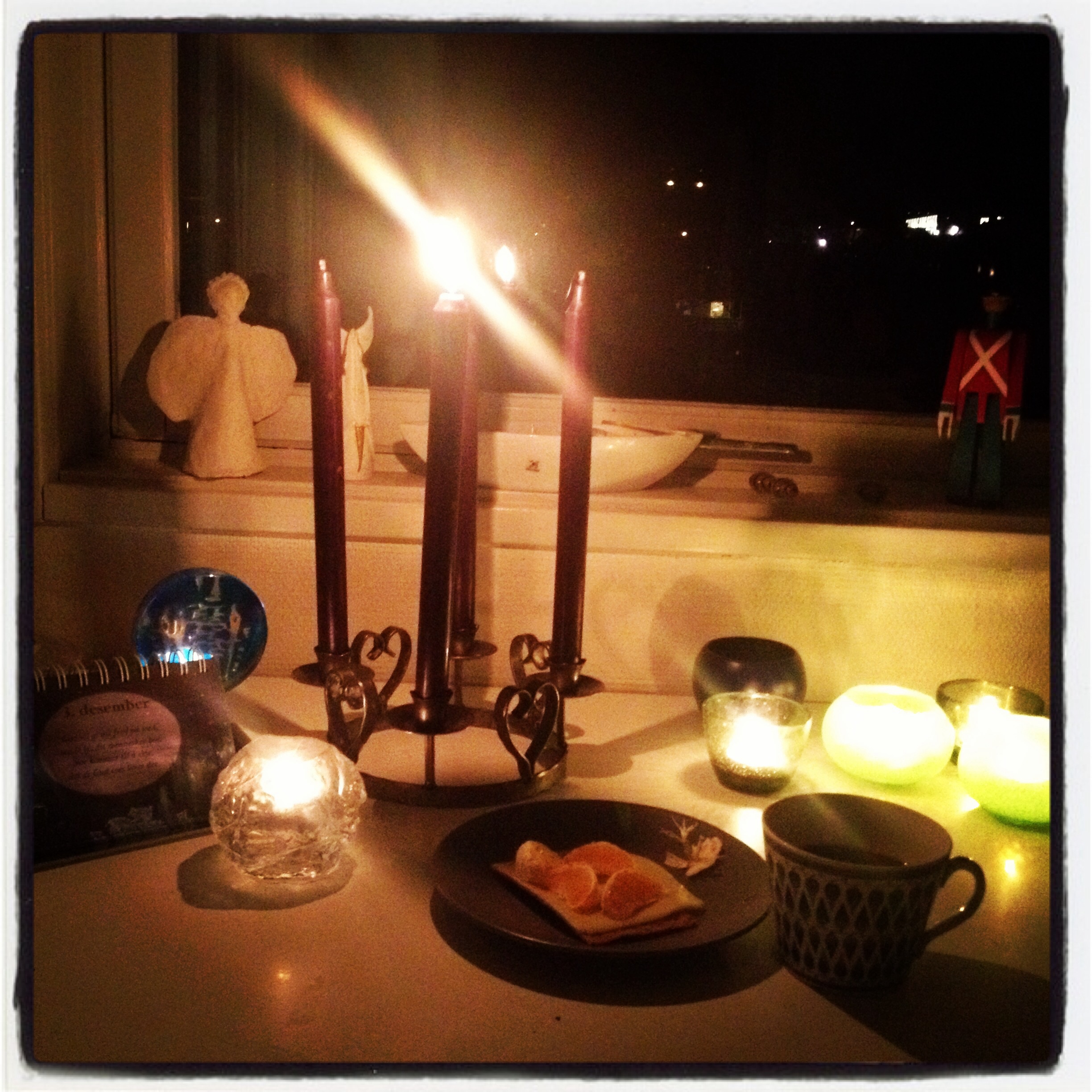 Dei siste åra har eg operert med ein slags adventkalendar her med daglege luker… Det må då vera luke ein som kunne opnast i dag, sidan det er den andre i dag. I går vart det ikkje så mykje tid til adventlys, men i dag starta eg morgonen på beste adventvis med masse tende lys til kaffien og rugsprøen. Ei venninne av meg sa i går «Du har det jo bekmørkt i stova…» Og ja, eg skal innrømma at eg har den merkelege eigenskapen at eg likar mørke. Spesielt dersom eg kan kombinera det med mange tende stearinlys. Då blir mørket utanfor nesten som eit vernande teppe om huset…