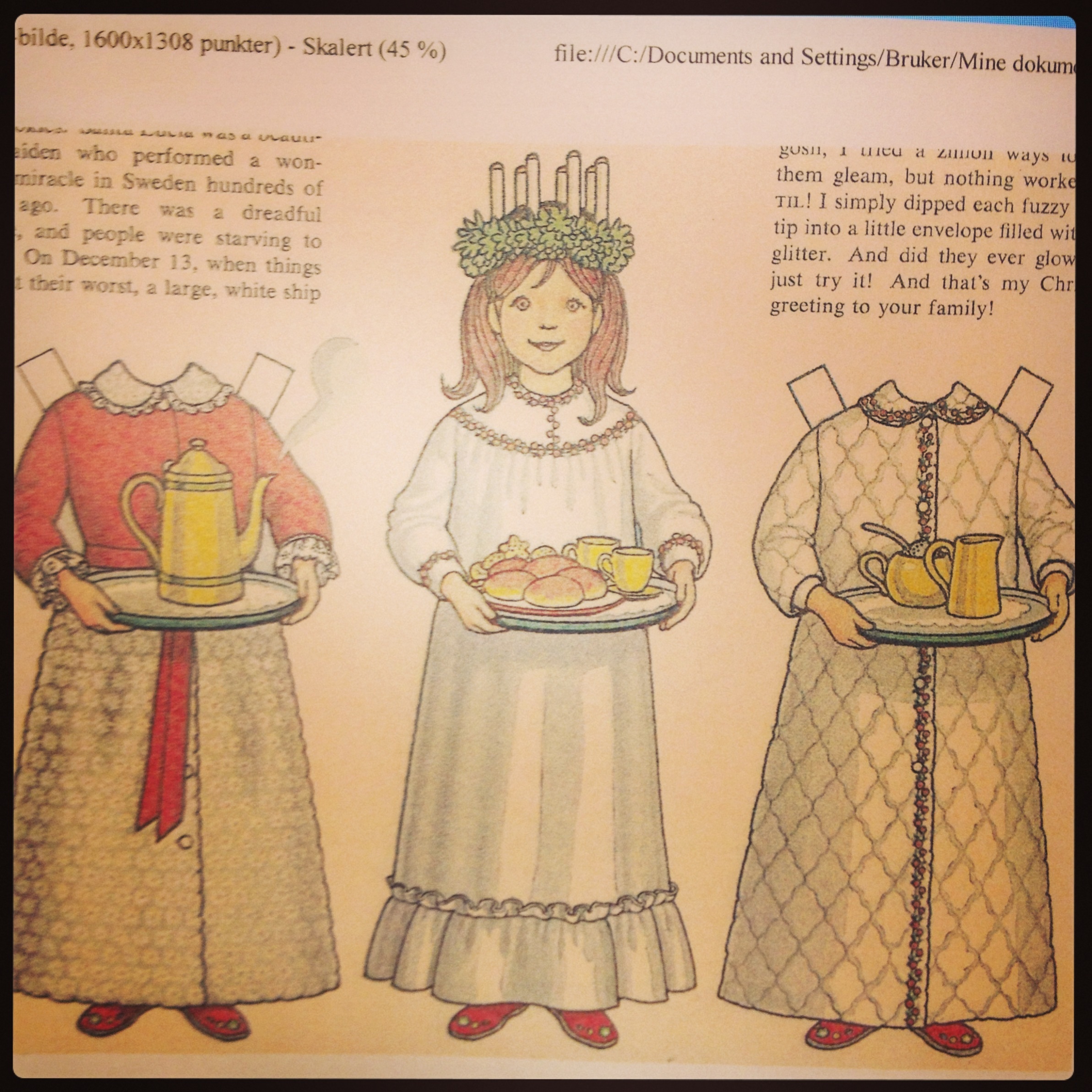 Sjølv har eg forresten eit barnsleg forhold til papirdokker. Då eg fann dette biletet på nettet av ei svensk Luciajente med påkledningsgarderobe, kunne eg ikkje la vera å printa ut og laminera litt som ei av oppgåvene barna kunne velgja å gjera etter forteljarstunda om Santa Lucia og Luciatradisjoner. Saman med engleglansa eg kjøpte nokre timar seinare, har dei ein vemodssukkersøt smak av barndom. Eg var veldig glad i glansbilete, men dei kom ikkje opp mot papirdokker, som var dei kanskje aller kjæraste leikene mine. Eg hugsar forresten framleis lukta av glansroser som blei pakka ut av plasten, og av limen frå tuba som me limte dei inn i albumet med. Me kalte dei for glansroser, på same måte som «roser» kan bety alle slags motiv i «rosemaling», kunne betydde ordet «rose» omtrent det same som bilete på gammal jærdialekt. Bestemor kalla teikneserieblad for «roseblad» og biletbøker for «rosebøker». Mykje gammalt språk er i ferd med å gå heilt i gløymeboka, dessverre… Eg burde kanskje skriva ned ord eg hugsar frå eg var lita som eg aldri høyrer lenger…