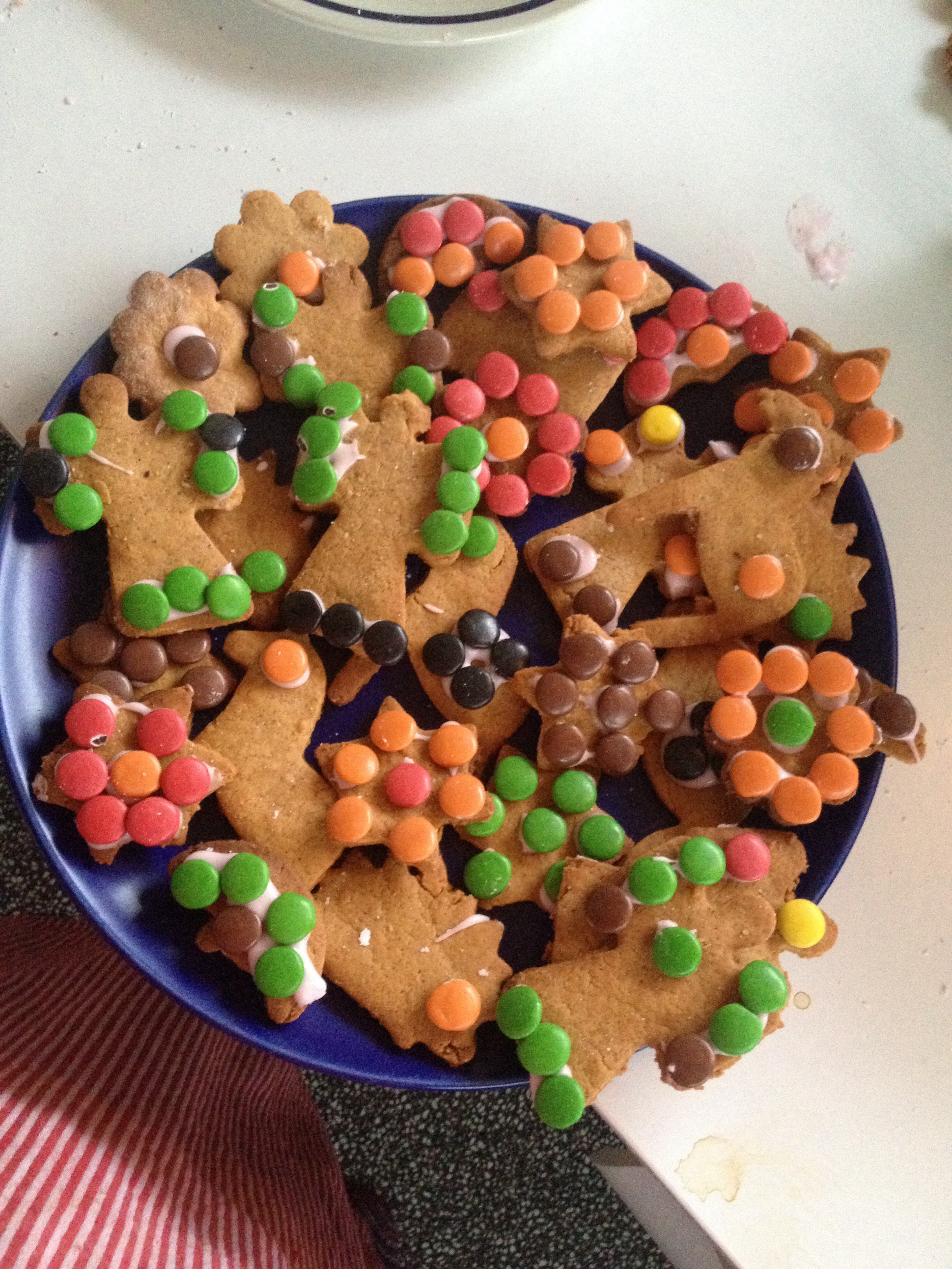 I år hadde eg lyst til å baka gode julekaker sidan det ikkje vart nokon bakst i fjor. Desse peparkakene skulle eg laga frå botnen av etter gammal oppskrift med pepar og all slags kryddar. Deigen var veldig vanskeleg å jobba med, og kakene vart harde, men dei smakte godt. Då dei vart pynta med melis og nonstop, kom dei seg fleire hakk…