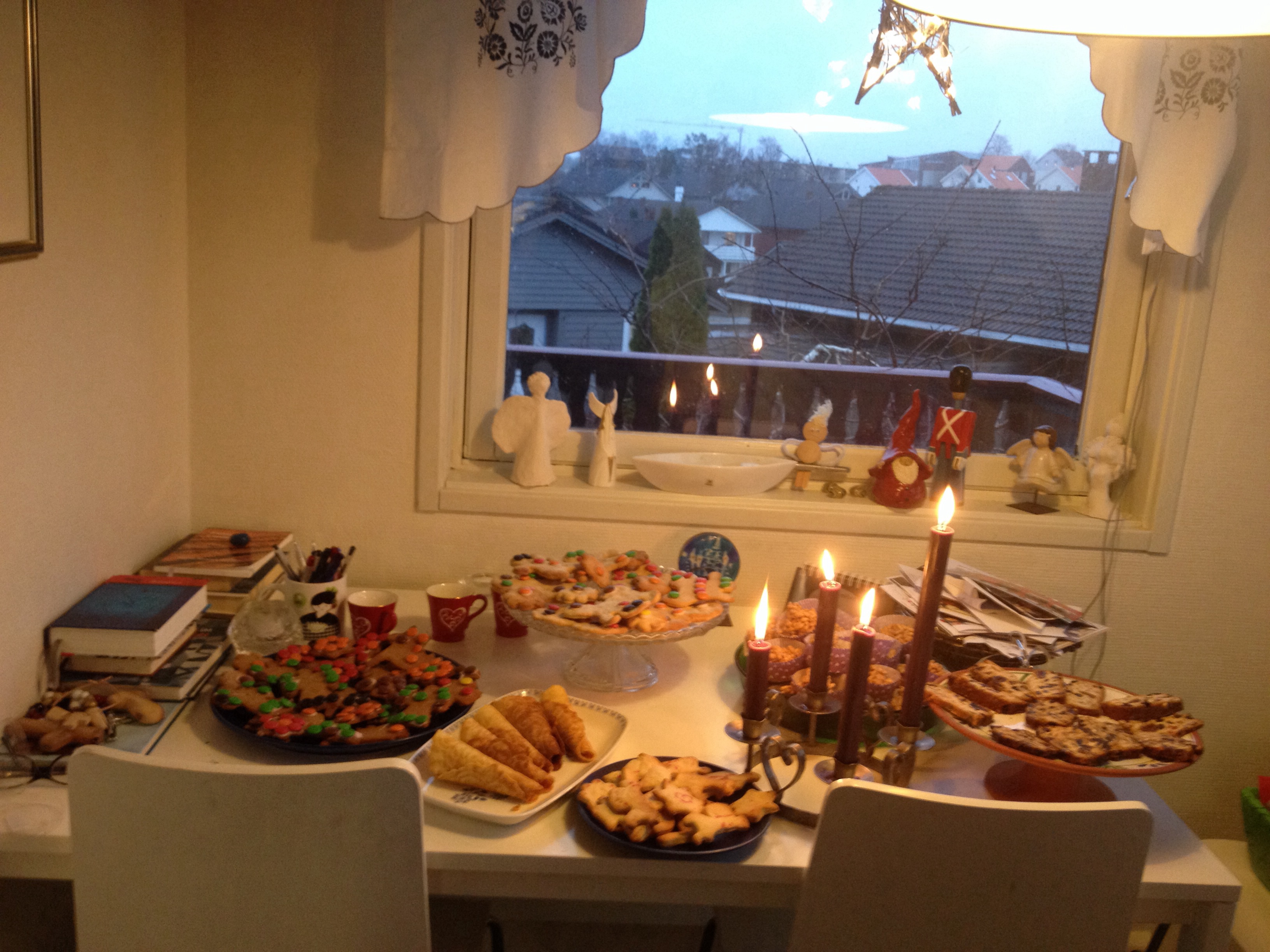 Eg vil påstå at eg har gått på med krum hals og sterk vilje, men det einaste som var ubetinga vellukka var krumkakene. Eg bakte nye peparkaker med ny oppskrift, denne gongen ei gammal svensk oppskrift med mykje sirup, desse vart mjuke, ein slags mellomting mellom kvite kakemenn og peparkaker, og smakte nesten som nordlandslefser. Kakemennene vart harde og ujamnt steikte, men kom seg med litt maling. Fruktkaka som har stått i kjøleskapet i over to veker for å mognast, vart mykje tørrare enn eg hadde rekna med, og så den eg hadde tenkt å bruka til julegave… Nå blir det nok heimebruk i staden, og sidan eg bakte tre av dei, får eg ynskja velkomen til kaffi og fruktkake på kjøkkenet.