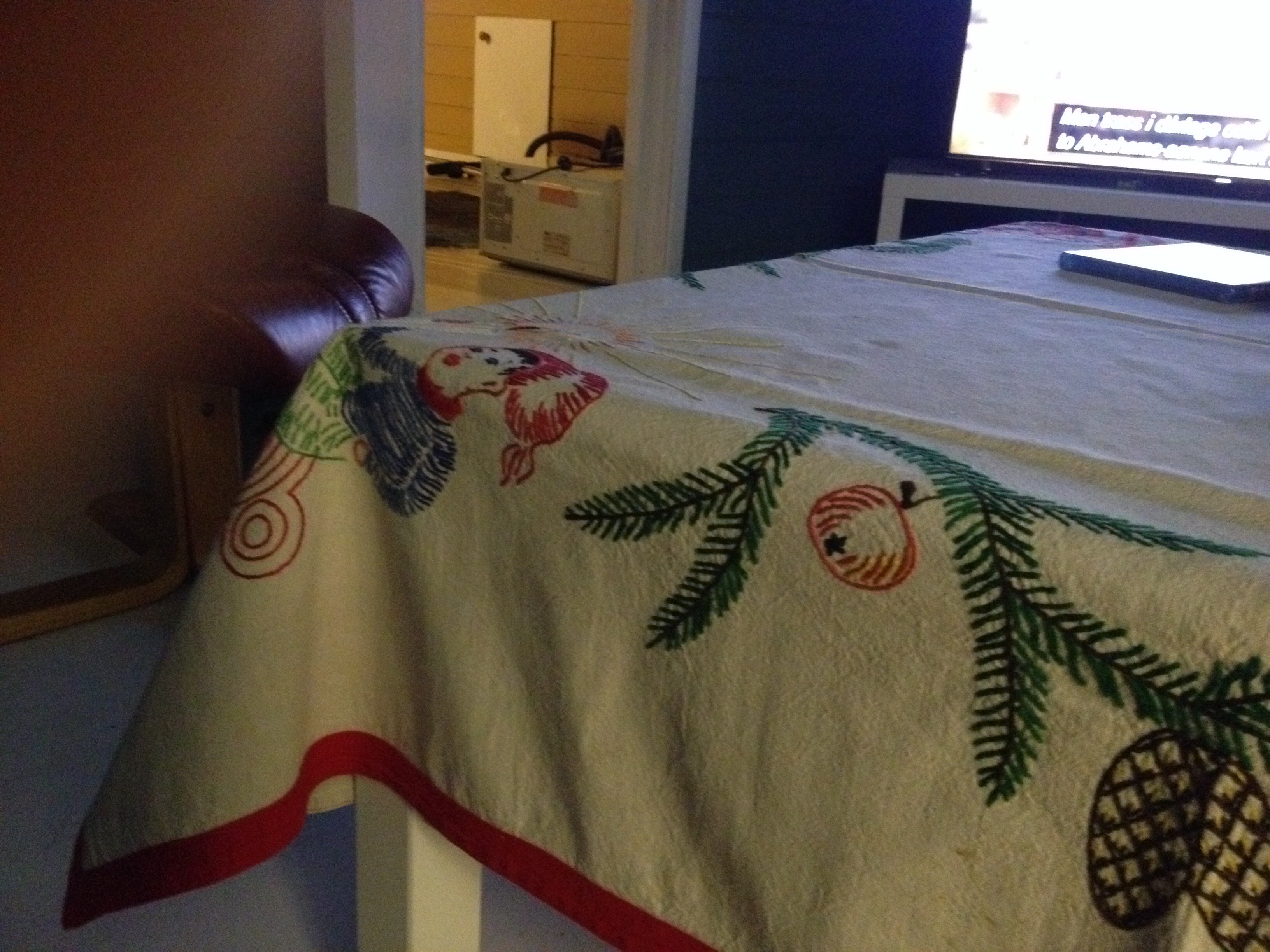 Denne handbroderte juleduken låg alltid på det runde bordet i stova i Bærum i jula med store fat med frukt, konfekt, fiken, nøter og dadler på. Eg veit ikkje om det er ho sjølv som har brodert eller om ho har fått han av nokon. Det er rart med desse tinga ein finn fram kvar jul. Ein får eit nokså sentimentalt forhold til dei. Då me rydda julepynten i dødsboet var det ikkje lett å kasta små lam med tre fyrstikkbein, gamle skrantne flettekorger i glanspapir og vattkuler med glitter på frå krigsåra… Om noko vart kasta i det heile tatt veit eg ikkje. Eg høyrde ein historie som blir påstått å vera sann, om ein familie som ende opp med å trenga advokathjelp når julepynten etter foreldra skulle fordelast, dette på trass av at dei var kome relativt heilskinna ut av deling av sølvtøy, møblar og gamle bøker… Og i tilfelle nokon i svigerfamilien min skulle lura i desse dagar på kor juleduken er blitt av, han ligg her hos oss, på bordet i den blå stova på loftet…