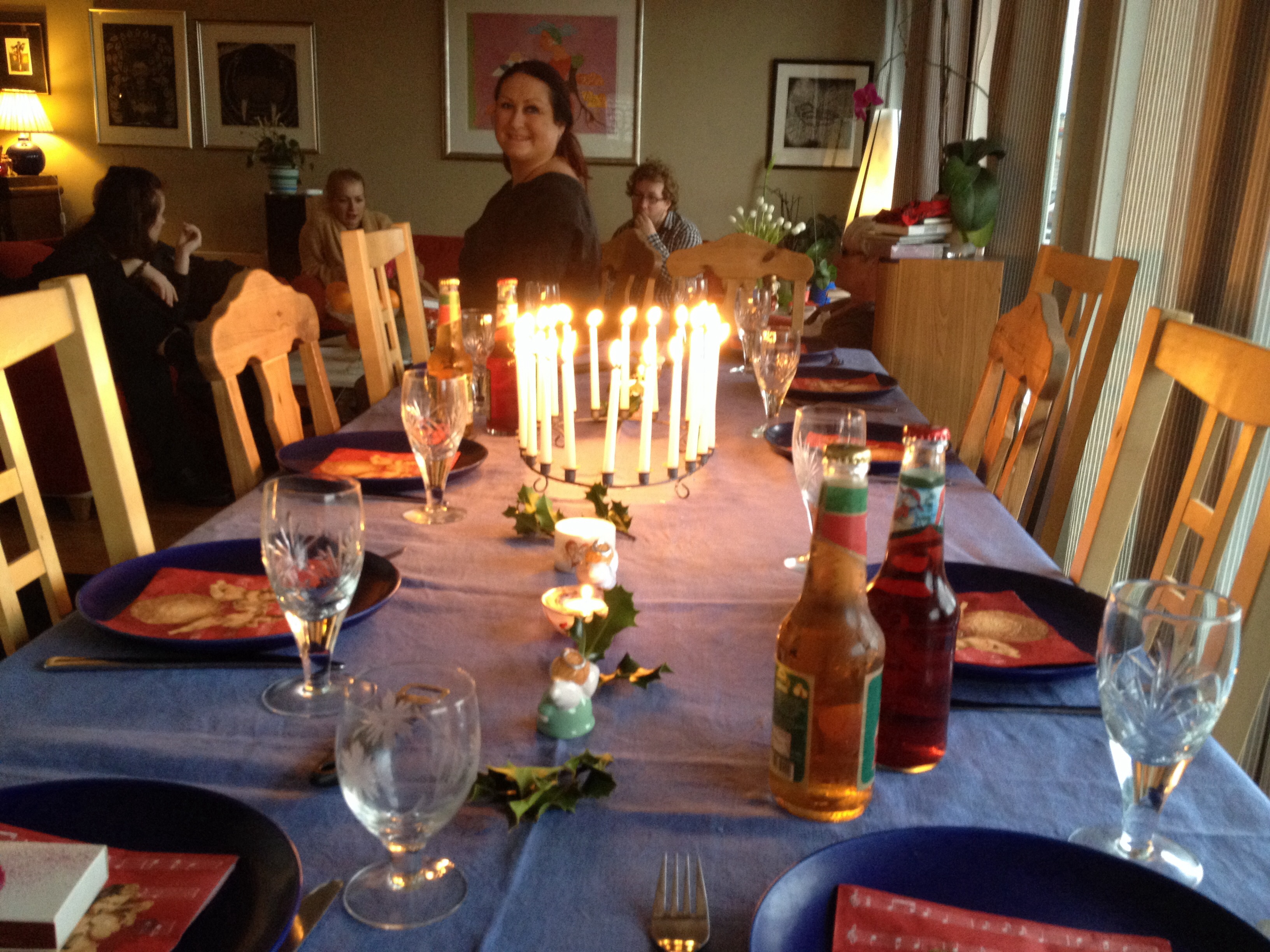 I føremiddag tok eg av den mønstra røde juleduken og la på ein himmelblå i staden. Eg hadde lyst til å bruka den store lysestaken der juletrelysa står tett i tett. Eg fekk han til jul av svigerinne Astrid, eller var det Eva Mari for ganske mange år sidan, og nå hadde eg hugsa å kjøpa inn jueltrelys. Føremiddagen gjekk med til å ordna og setja fram masse julemat, ribbe, karbonadar, røykjelaks, ost, kjeks, flatbrød, eggerøre, flatbrød, lefser, krumkaker, multekrem, risbollar, peparkaker, varme rundstykke, julegeiter, aniskringler… og jammen trur eg heilt at me gløymde å setja fram silda. Sjokolade, frukt, eplemost, brus, rabarbrasaft, julekaffi… Og så kom mor med fleire lefser, May Brit med potetsalat og rekesalat og Jensi med heimelaga vørterbrød. Me kunne nesten ha konkurrert med selskapa på Katthult… I utgangspunktet var me ti til bords, og akkurat så mange får me plass til rundt spisebordet. Etterkvart ramla det inn fire gjester til, og endå fleire var inviterte. Eg trur me kunne ha invitert fire gonger så mykje gjester og framleis hatt mat att, for eg hadde følelsen av at eg rydda vekk nesten like mykje mat som eg sette fram. Det er fint å samla mange menneske, og det blir ikkje så ofte me gjer det lenger. Me var flinkare til å invitera då ungane var små. Ute har det vore ein slik dag som aldri har blitt heilt lys, så det var ein god dag å vera inne på.