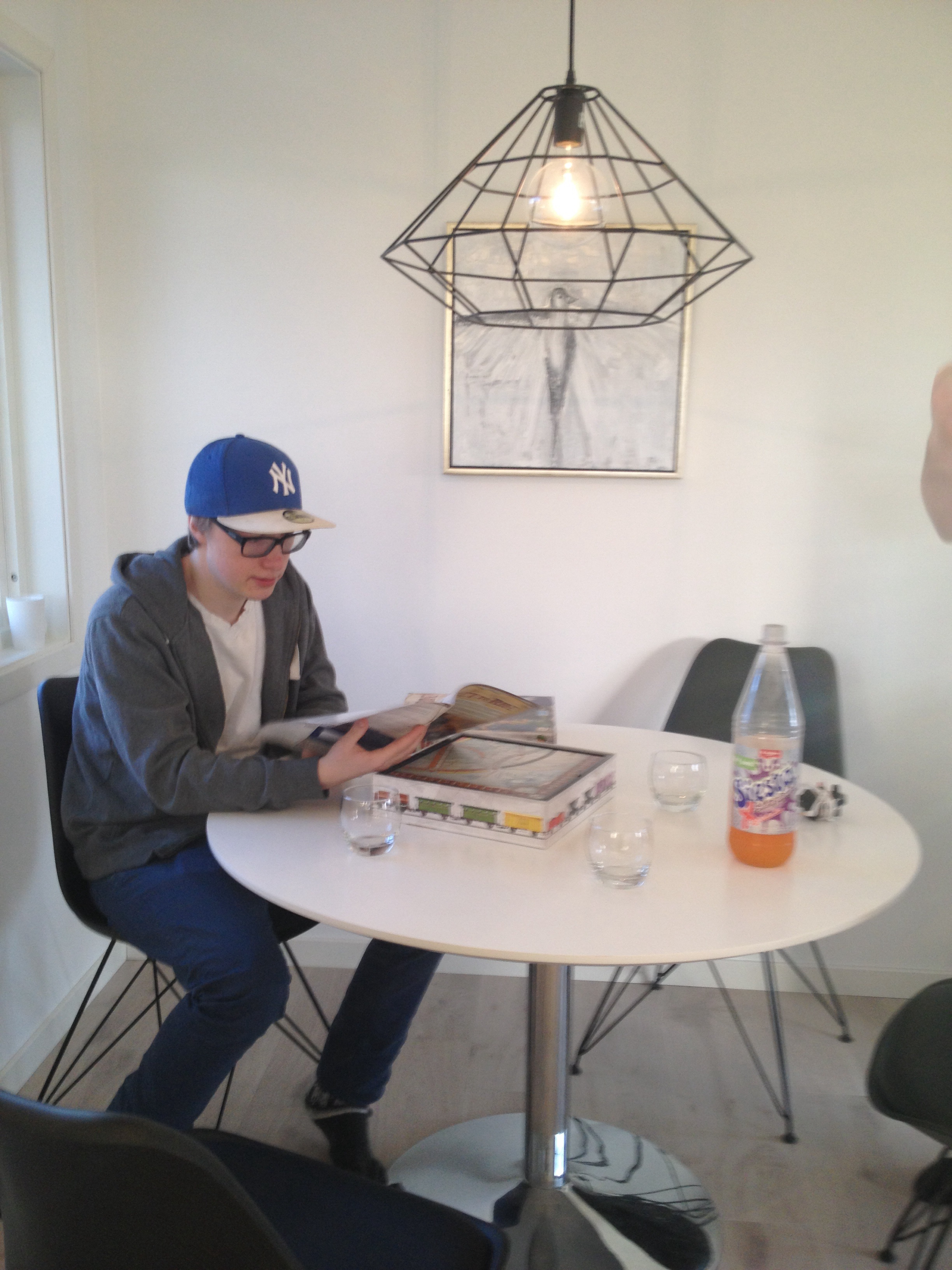 Og kjøkkenet er blitt fint. Her med ein spelande gjest for anledningen. Ingrid sitt duebilete er kome på plass på veggen.