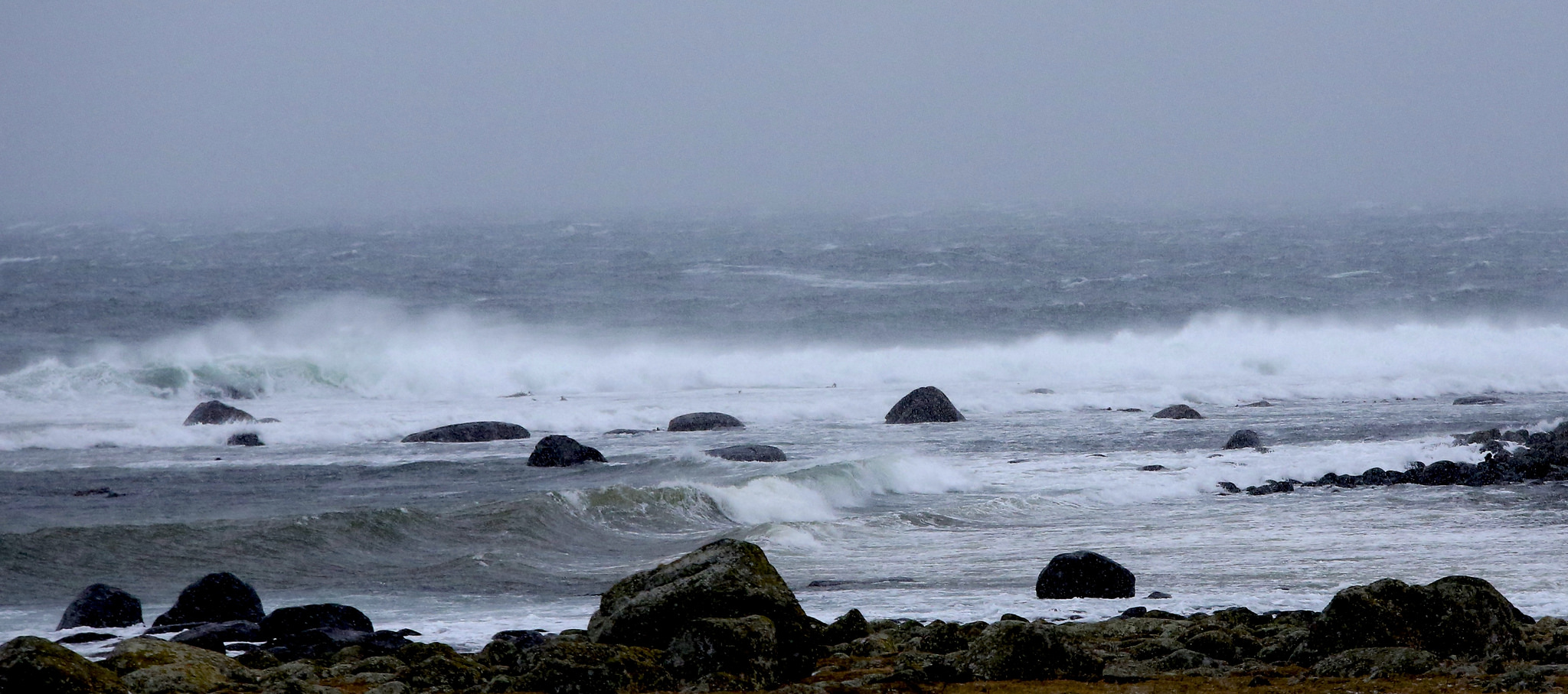 Nede ved sjøen bles det så kraftig at eg ei stund måtte ta av brillene fordi dei haldt på å fyka av ansiktet. Eg er usikker på om ein helst bør vera fødd og oppvaksen her for verkeleg å kjenna kor fantastisk flott det er å stå nede ved sjøen i det som må nærma seg liten storm og nesten streva med å halda seg oppreist. Det er noko fascinerande med synet, og noko frigjerande med å få så masse naturkrefter midt i ansiktet. Eg måtte opp med mobilen for å prøva å dokumentera korleis det var…