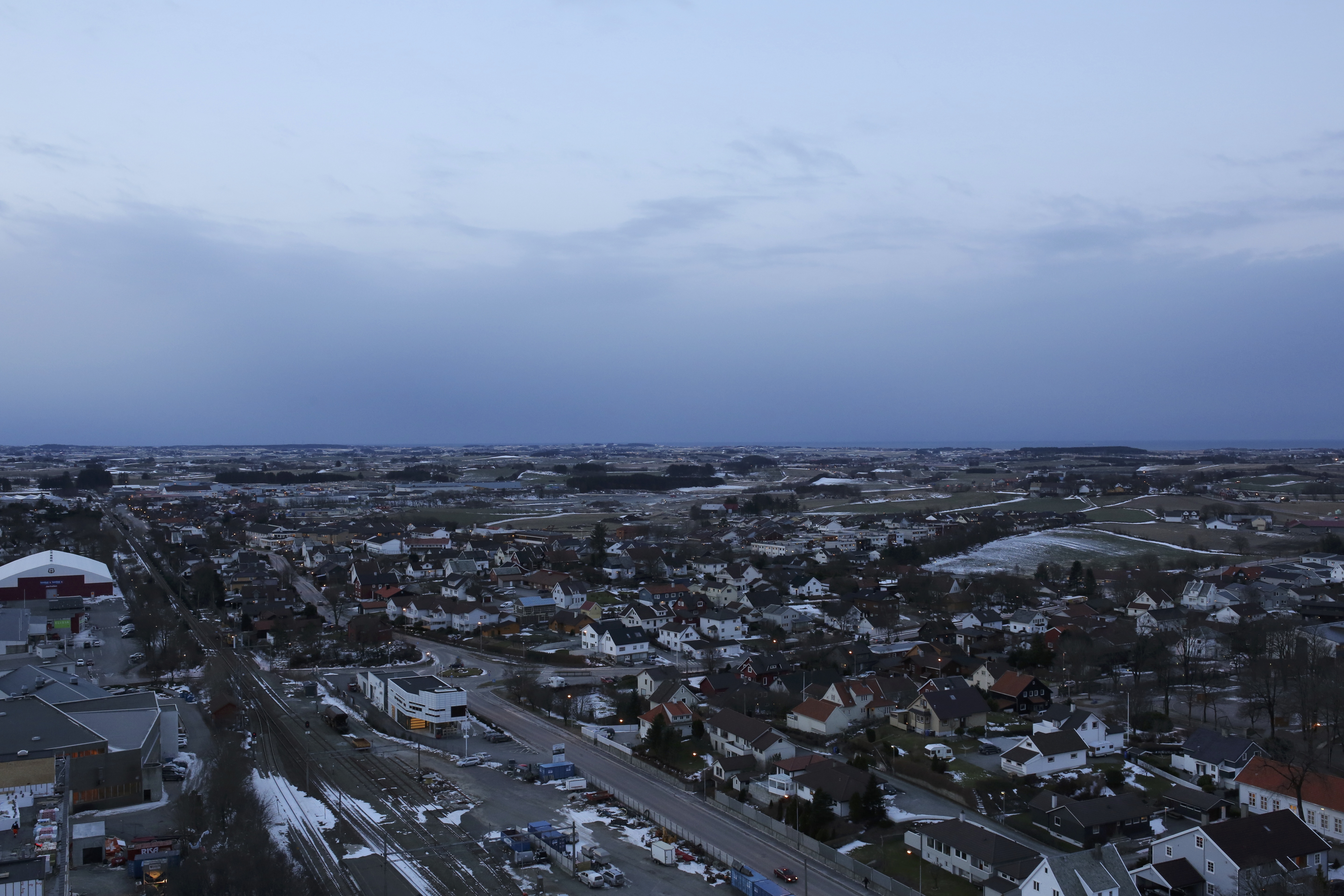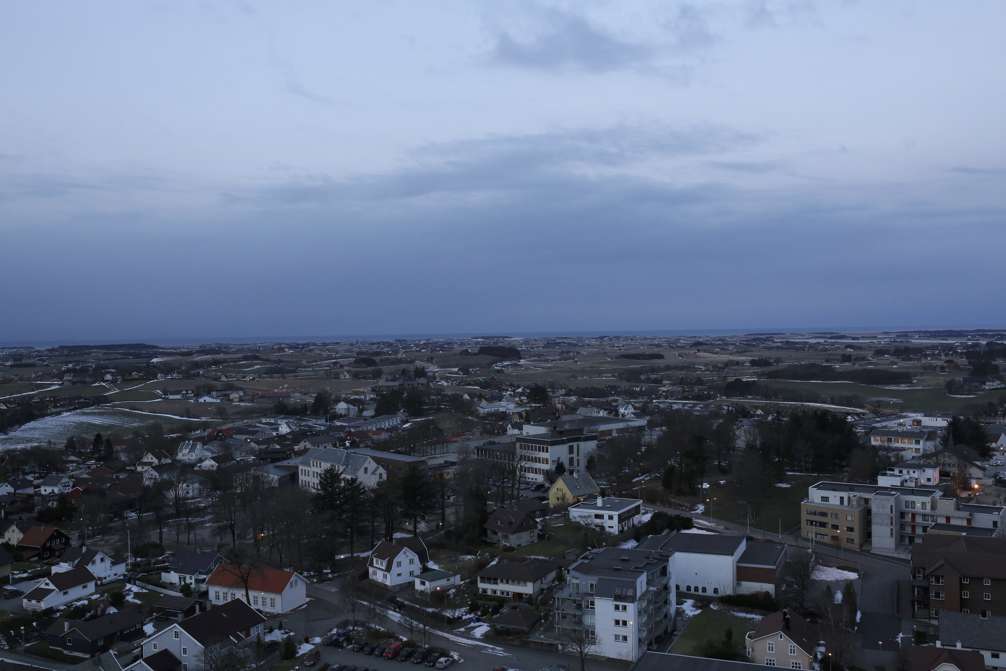 Til dei som ikkje kjenner landskapet mitt: Slik ser den vesle byen eg bur i ut sett frå det einaste høghuset i mils omkrins. Arbeidsplassen min er det gamle kvite treetasjars murhuset midt i bilete, bygd ut med ein moderne bygning med flatt tak. Og utanfor i vest bryt havet på, mot ei sju milers lang sandstrand som det står i boka.