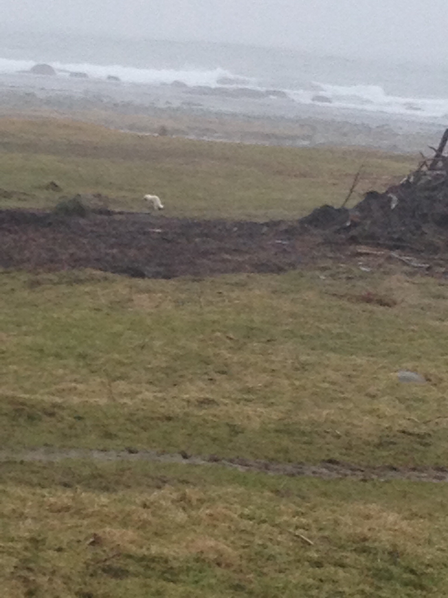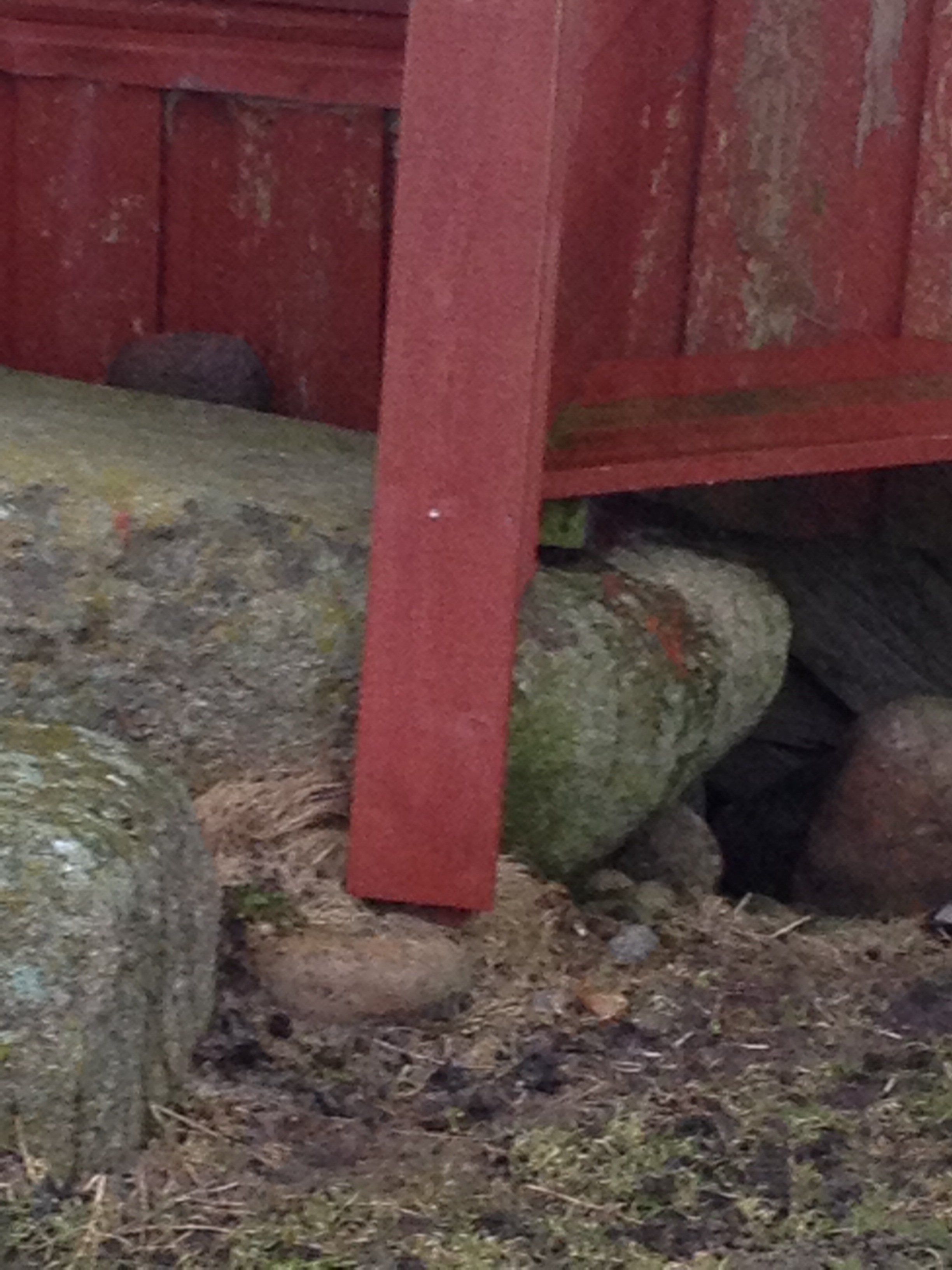 Lenger nede såg me plutseleg eit heilt kvitt dyr, det kan ha vore ein røyskatt, mår eller snømus. Skiftar dei to første farge om vinteren? Det kikka forvitent på oss, men stakk av og inn under eit gammalt hus då eg tok opp mobilen for å fotografera. Dyret kan så vidt skimtast på dette biletet, men eg innser at her ser det neste ut som ein hund eller ein katt… Som om nokon prøvde å lyga på seg den eine store naturopplevinga etter den andre…