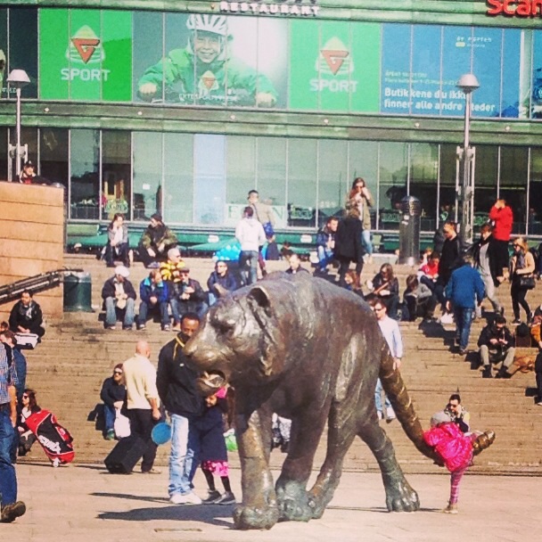 Det gjekk som det suste nedover, og eg hadde veldig god tid. Eg hoppa av på Nasjonalteateret stasjon for å nyta sola på Karl Johan. Eg kjøpte meg eit = Oslo, og sette meg ned utanfor sentralbanestasjonen for å lesa i sola. Eg hadde faktisk ei kjensle av at eg kanskje kunne treffa nokon eg kjende.