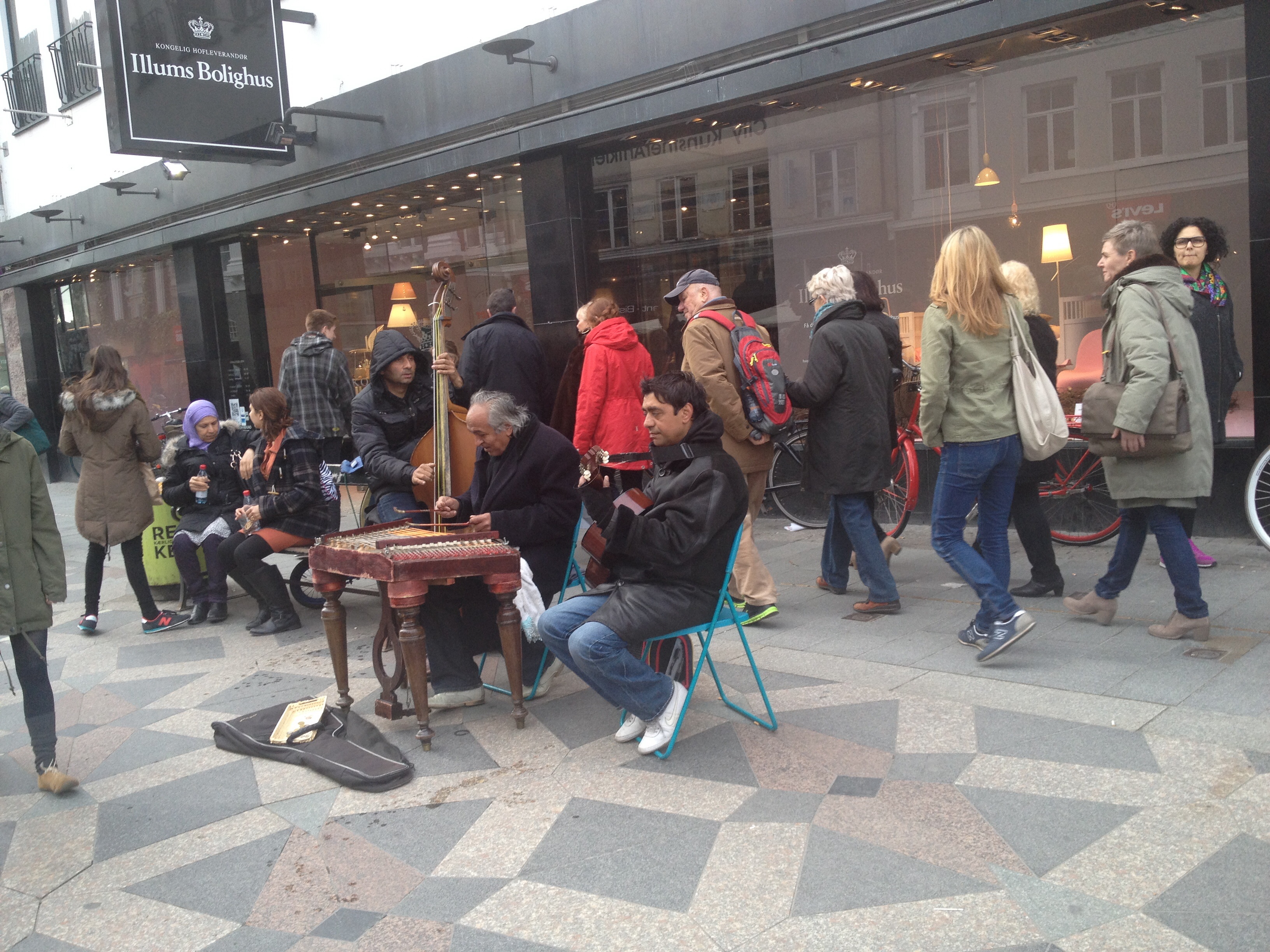 Midt i gata går ei godt vaksen dame med langt hår, eit fortvila blikk og eit ballettliknande antrekk. Ho hyler til når ho dunker borti folk og ser svært forvirra ut. Ei anna dame går midt i gata og snakkar høgt og opphissa. Eg kikkar bort for å sjå om ho har headset og telefon på seg. Det har ho ikkje. Ein ung far småspring gjennom gata med ein fireåring på akslene. «Nu skal jeg lige spise deg,» seier han med låg trollet-under-brua stemme. Barnet på skuldrene hans hyler av fryd.