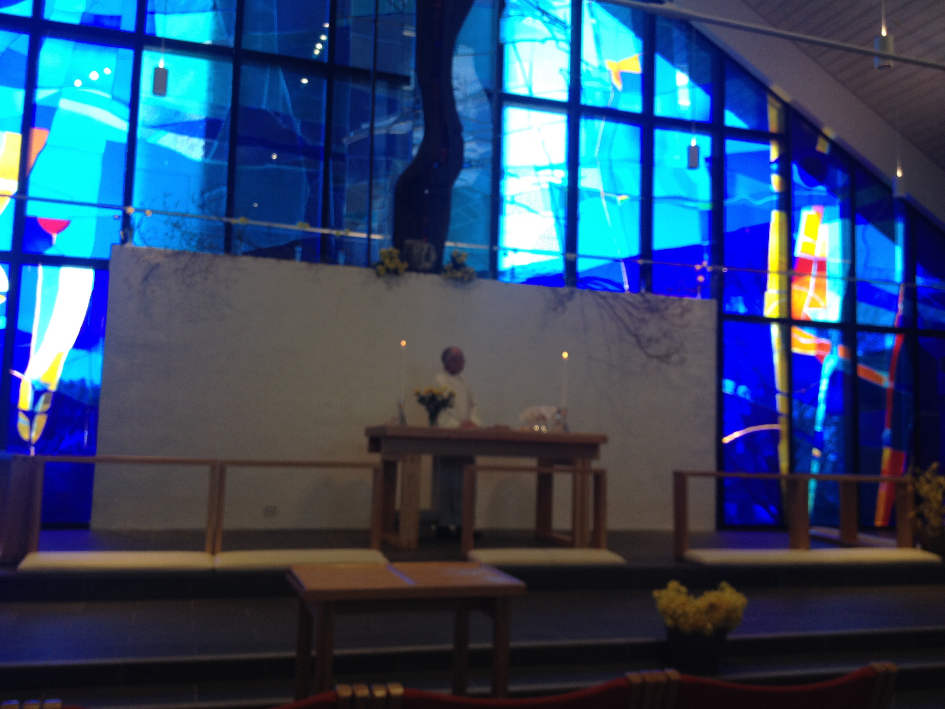 Den songen må eg få vera med og synga før det blir skikkeleg påske. Sjølv om det vart grueleg seint for både den eine og den andre i går kveld, så kom me oss på påskedagsgudsteneste, eg og Leif og Sunniva. Glasmaleriet var nydeleg i føremiddagssola, kyrkja var fint pynta til påske, og Åse Hetland sitt trompetspel løfta oss nesten til himmelen. Medan me song: «Nei, det trengs ingen blomster til graven,» delte barn og ungdomar ut påseliljer til alle som var i kyrkja. Gudstenesta i dag var av det slaget som fyller ein med glede. Det er ikkje heilt alltid ein får sånne sterke gudstenesteopplevingar, men det hender.