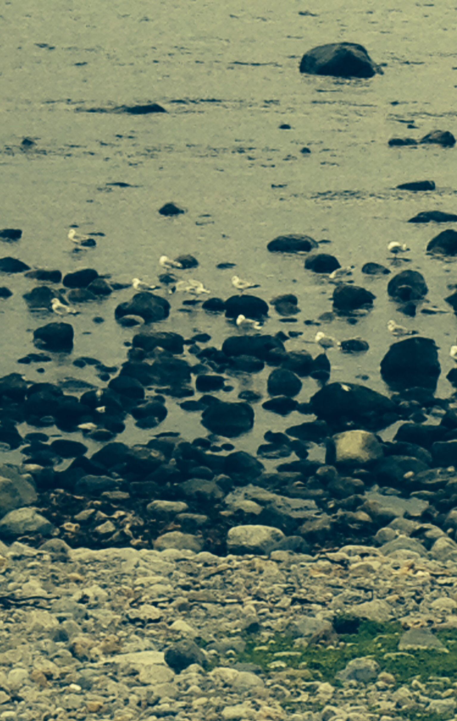 Måkane ser nesten ut som om dei sit der og småhutrar litt i fjøresteinane.