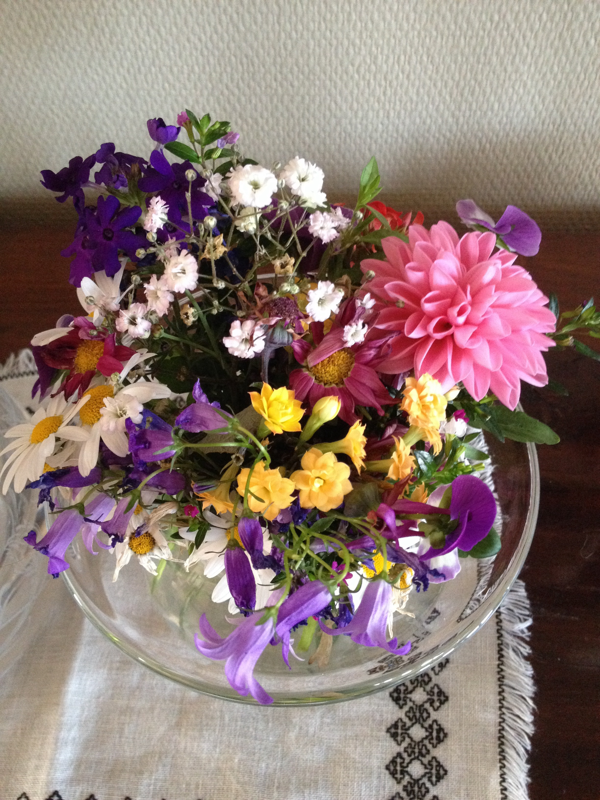 ODet er pinse og det er sommar. Eg har alltid likt godt å plukka blomar, og sidan huset stort sett var stengd for reingjering på grunn av akutt sommar i går måtte eg i det minste gå ut i hagen og plukka meg ein pinsebukett. Duken under i svartsaum har farmor brodert til meg for ikkje så veldig mange år sidan. Første pinsedag er eigentleg ein dag eg likar å gå i kyrkja, men i dag fekk det bli radiogudsteneste med fine sommarsalmar, for Leif skulle kjørast til flyplassen. Som ein snusmumrik frå Mummidalen, kjem det dagar for han då det er på tide å pakka ryggsekken, ta på seg reisehatten og dra ut i verda på eventyr. Akkurat nå sit han på flyet til Buenos Aires, og eg håpar han får ein riktig fin tur.