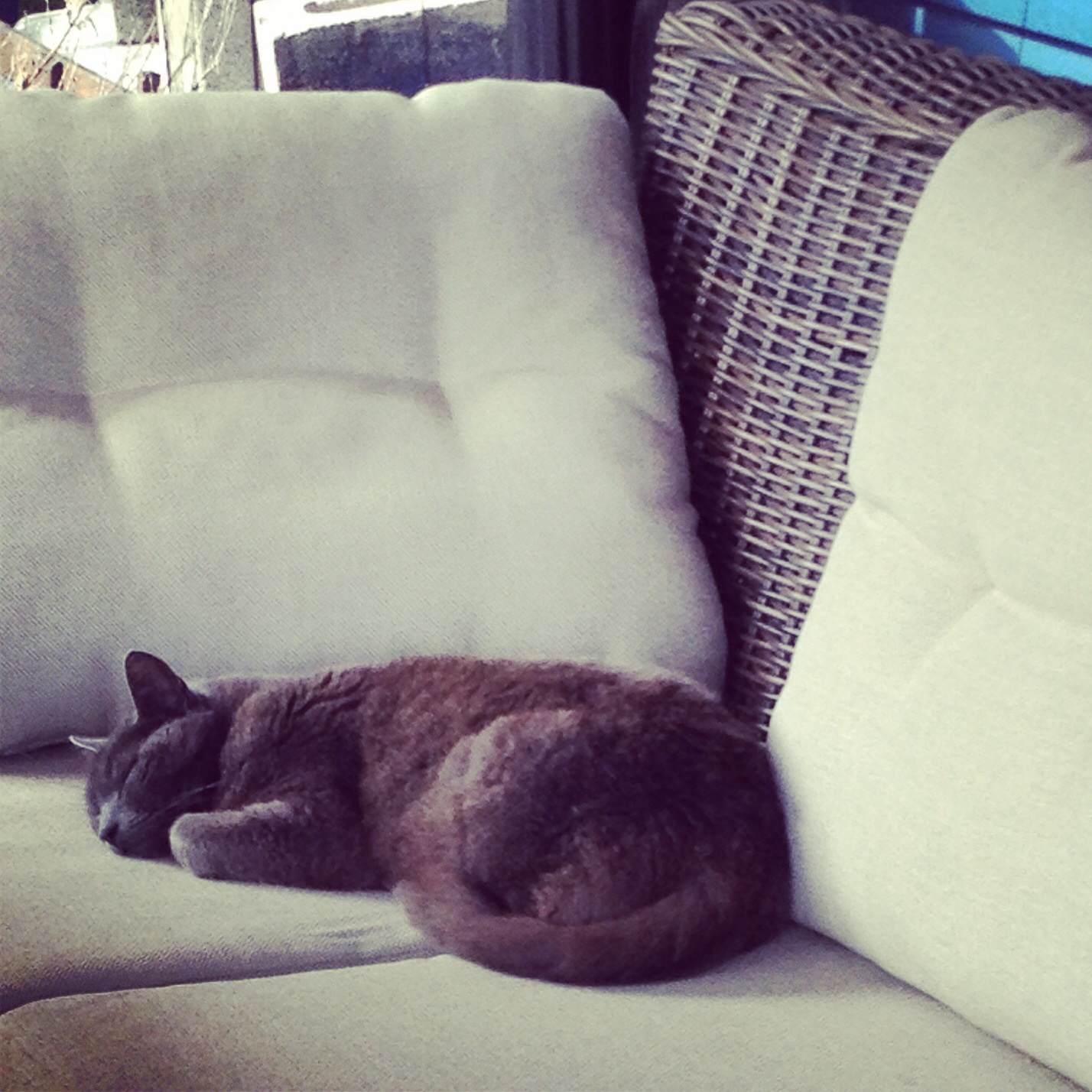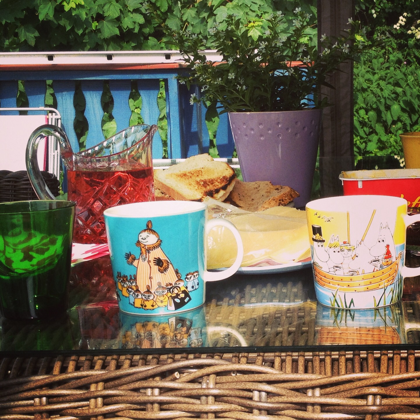 Før han reiste rakk me frokost og kaffi ute i sommerdagen med båtkopp til han som skal reisa og ein kopp meir eigna til dei som skal vera att heime og omgåst førsteklassinger, til meg.