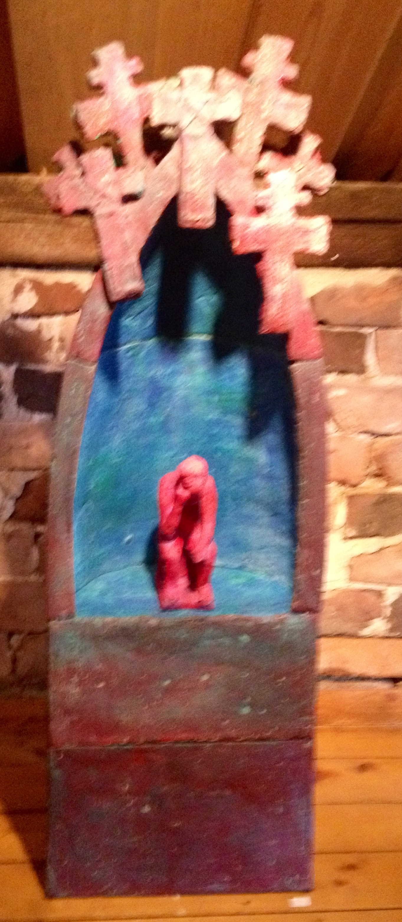 For meg vart den sørgande, eller skal eg kanskje heller omsetja det til » Den triste Kristus», ei viktig brikke i utstillinga. I det katolske Polen er den triste Kristus » – » Chrystus frasoblivy», eit velkjent motiv. Kanskje hadde me trengt å bruka han oftare her heime og? Dette fotografiet er ikkje heilt skarpt, men eg ville så gjerne ha det me.