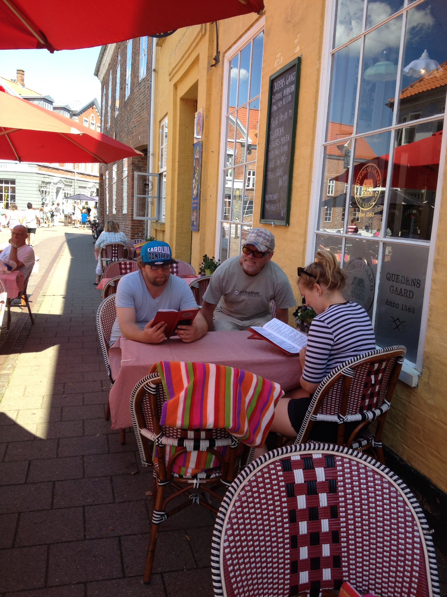 Me åt lunsj på ein koseleg gaterestaurant og på menyen kunne me lesa at mannen som opprinneleg åtte dette huset ein gong for veldig lenge sidan, heitte Johannes Harboe. Kanskje me burde fått familierabatt.