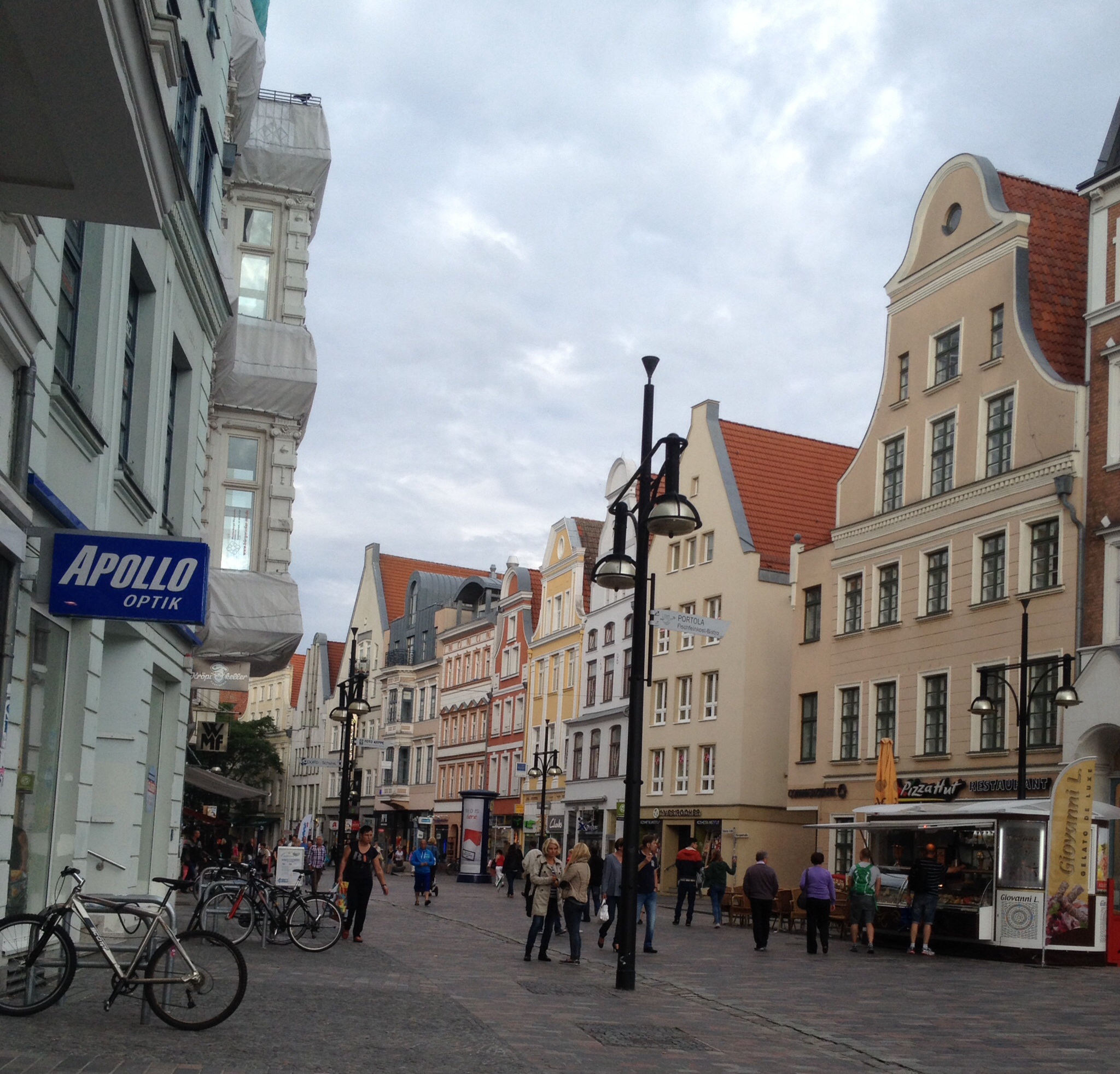 Neste stopp vart Rostock, ein Hansaby i tidlegare DDR. Byen viste seg å vera heilt nydeleg, og me fann ut at her ville me bu i natt. Dessverre vart lærdommen etter å ha kjørt opp og ned i einvegskjørde smale gamle bygatene, at dersom ein vil til Rostock ein laurdagskveld i juli med innlagd hotellovernatting, så bør ein bestilla hotell på førehand. Alle hotella viste seg å ha «alles belegt», eller så var dei nedlagde. Til slutt måtte me nøya oss med ein kopp kaffi på ein fortausrestaurant i hovudgata, det var idyllisk det og. Så sette me GPS- en på ein av fleire småbyar heilt ute ved kysten med hav på begge sider.