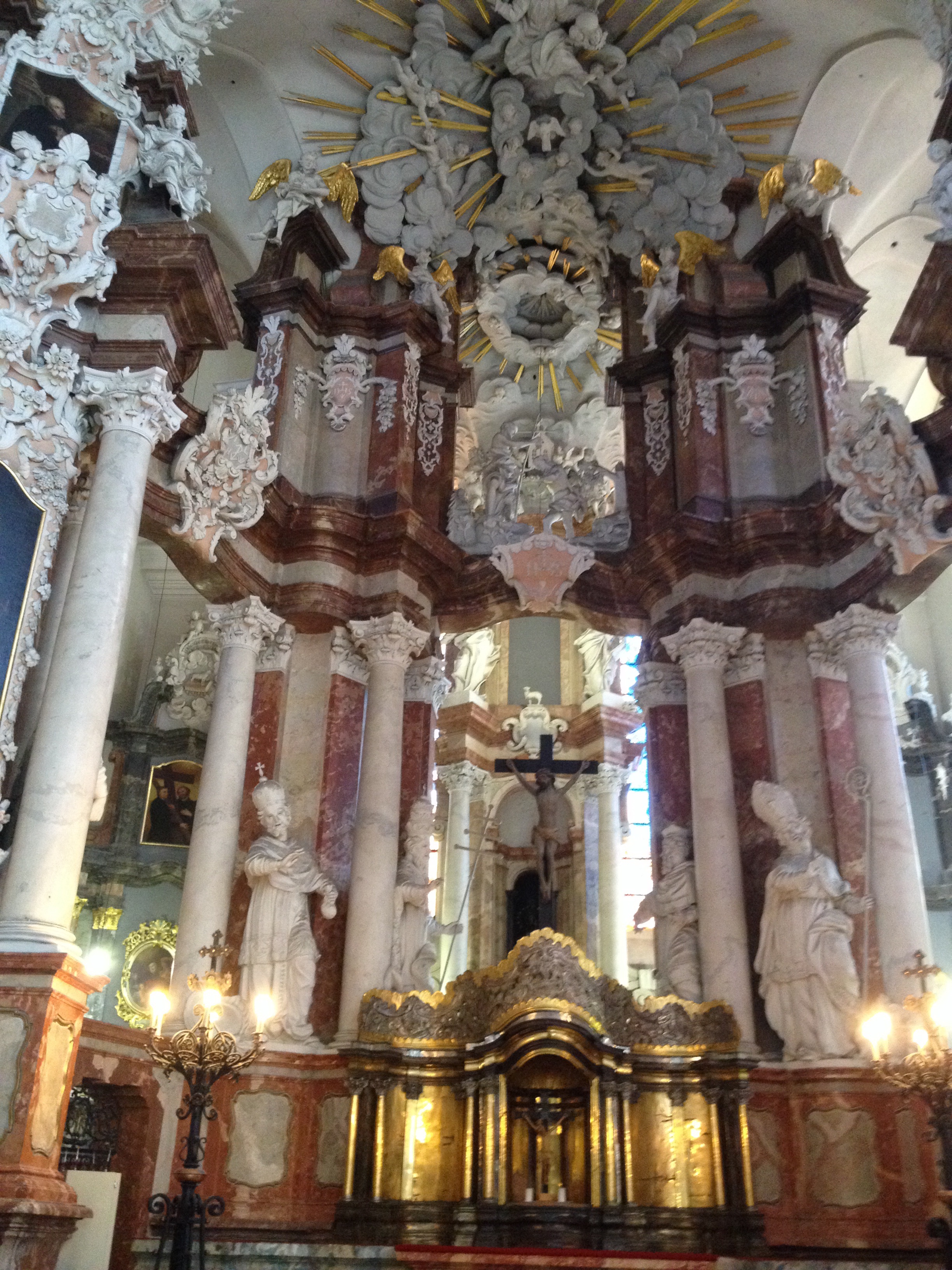 Framme i koret var det fleire rekkjer med søyler, skulpurar og andre objekt bak ein annan, og framstår på avstand som eit stort relieff i 3D. Eg har ikkje sett noko slikt før. Det mindre meg om gammeldagse pappkulisser ein sette bak einannan som dokketeaterkulisser eller dekorasjonar.