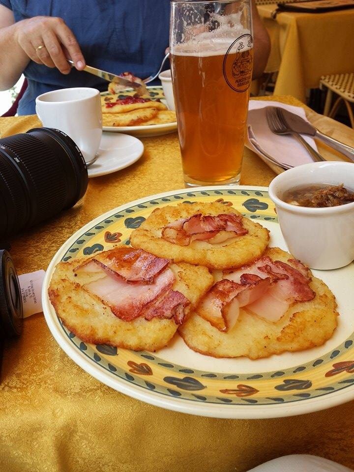 Lunsjen i dag var potetpannekaker, mine med tytebærsyltetøy og Leif sine med bacon. Det ser ut som om folk her har ete minst like mykje poteter her som heime i Norge, og på dei kafeane me har vore innom, serverer dei mykje lokal mat. Eg ser folk eta noko som minner veldig om rett og slett komler… Ikkje som pirogane i går, men som heilt ekte vestlandske komler.