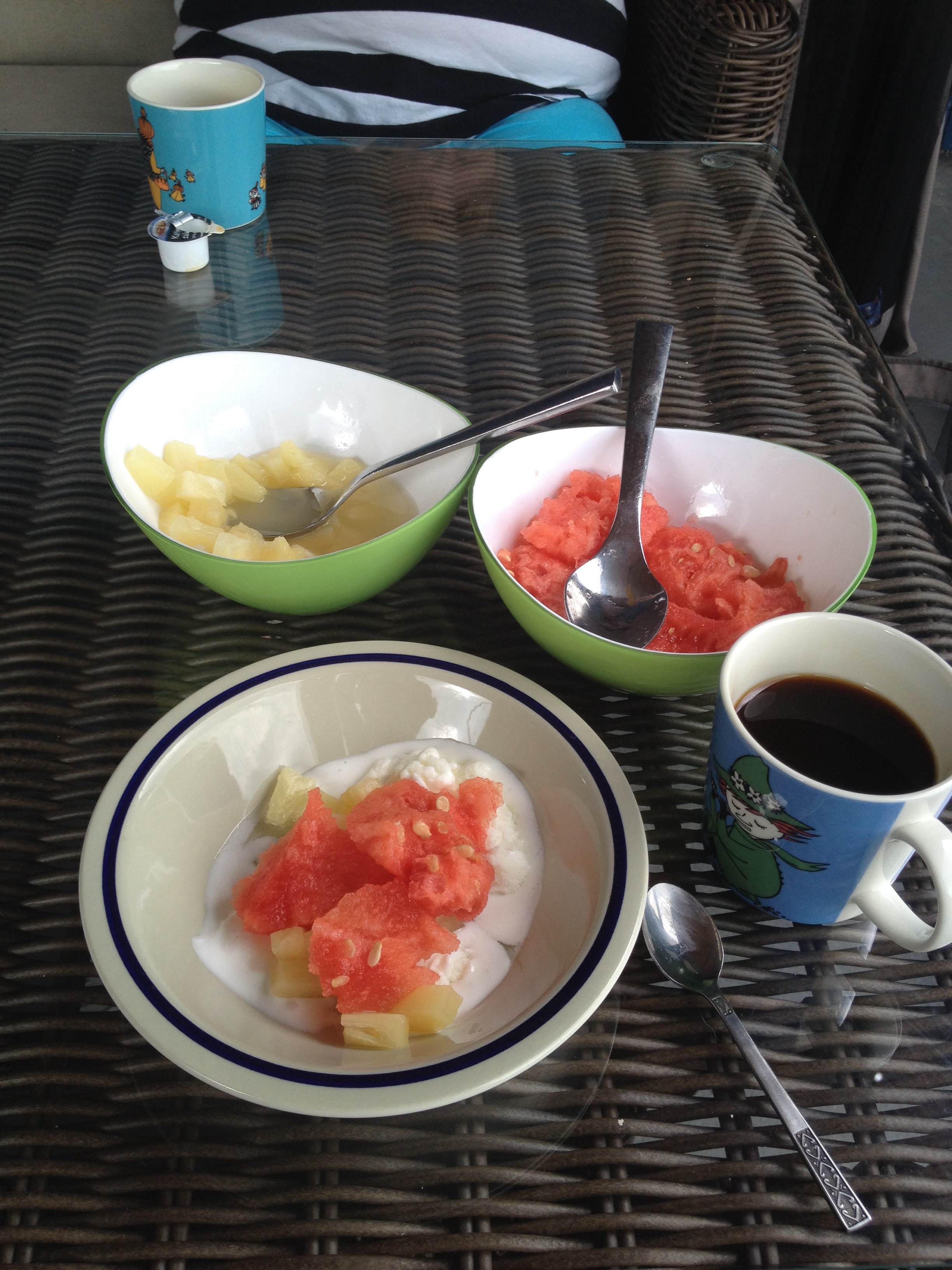 Slike dagar kjem ikkje på bestilling, og ein må nyta dei medan dei er her. I dag har eg unna meg den store luksusen å liggja paddeflatt på magen i sola og lesa bøker mellom slaga. For meg er det ein stor, stor luksus. I går hadde me nesten alle ungane her til middag på verandaen, og i dag har me hatt to kaffigjester same plassen, først Arne og så Laila, og det er deilig å bare vera lat saman med venner som stoppar innom og tenkja at alt som gjerast skulle og burde kan eg gjera i morgon eller kanskje i neste veke.