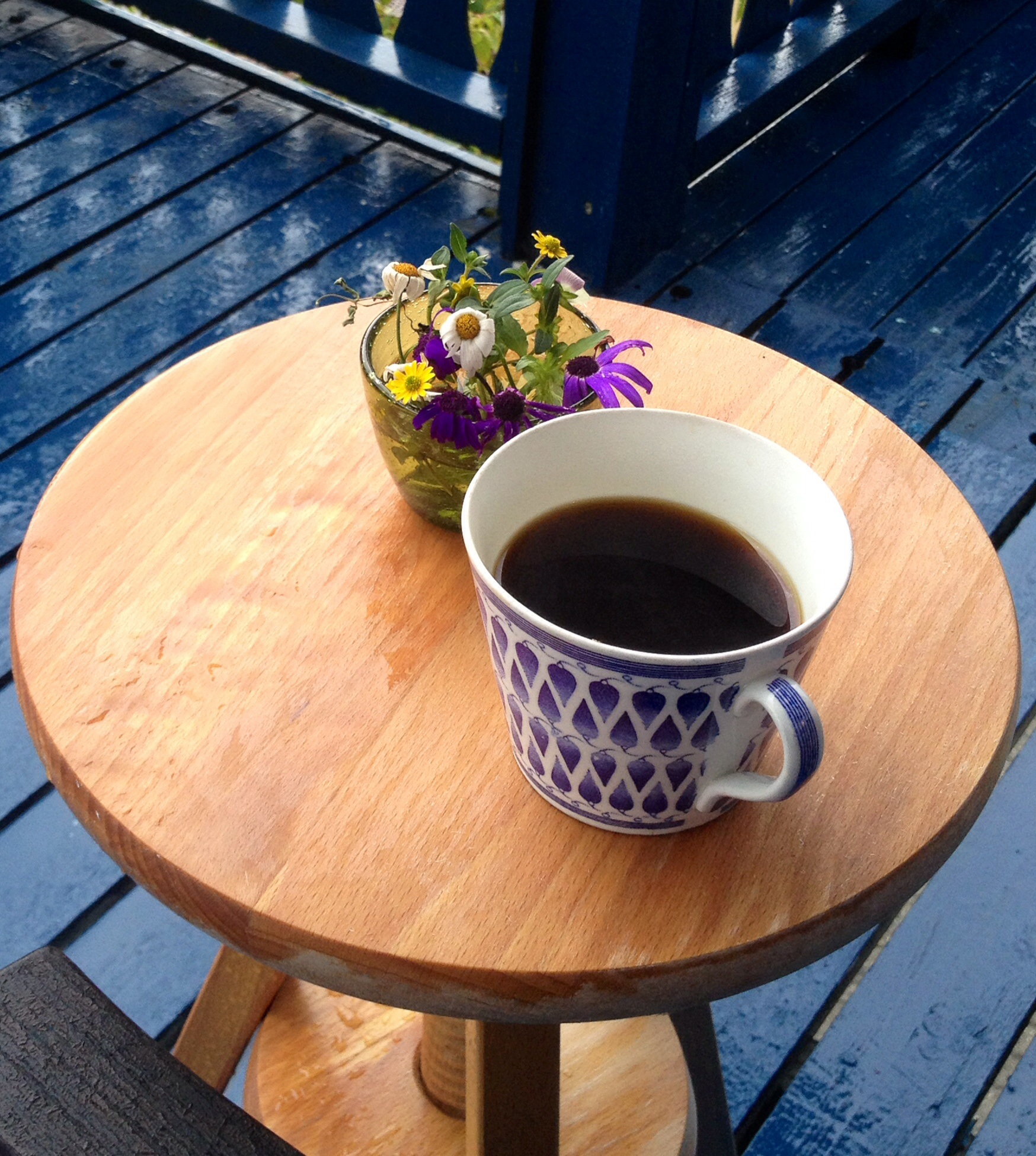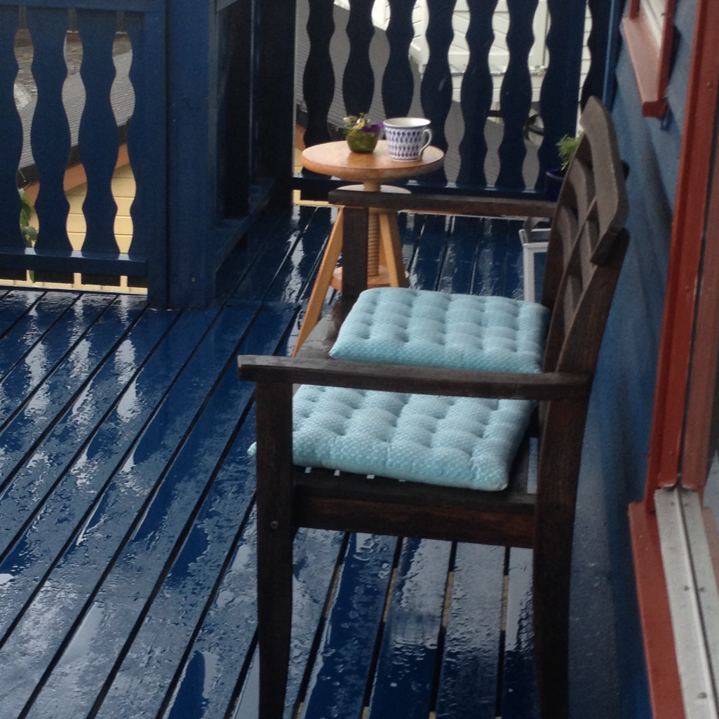 Eg oppdaga at viss eg sette meg på benken heilt inntil huset, så kunne eg drikka morgonkaffi ute og sjå på regnet nesten utan å bli våt.