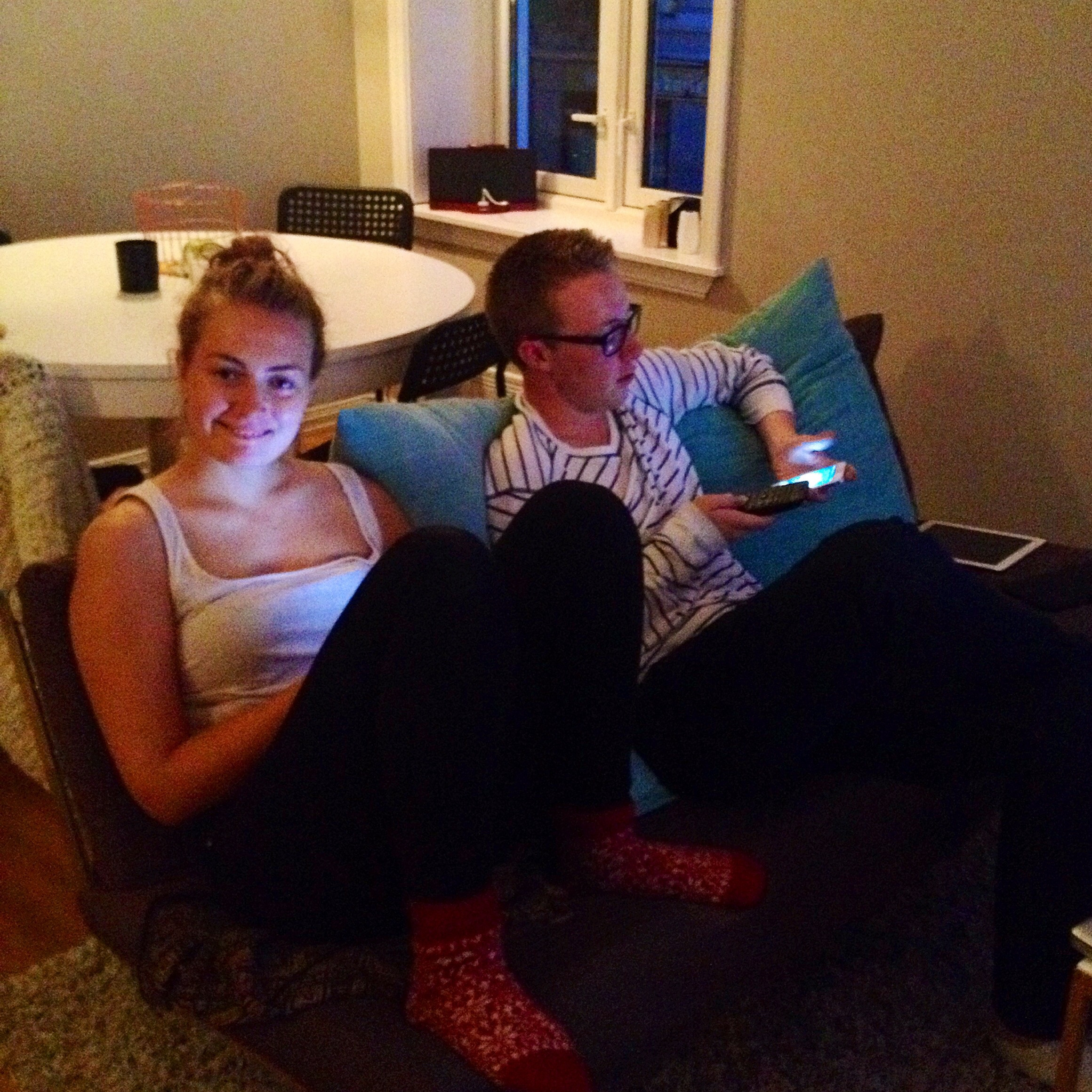 Og nokre fordeler skal ein ha av å ha mor på besøk, så me gjekk for å eta middag ute ein eller annan plass. Me ende på Olivia under ein varmelampe slik at me kunne sitja ute. Etter på gjekk me heim til Sunniva som var «aleine heime». Halvard hadde lyst på heimelaga vaflar, så då vart det vaffelsteiking og film.