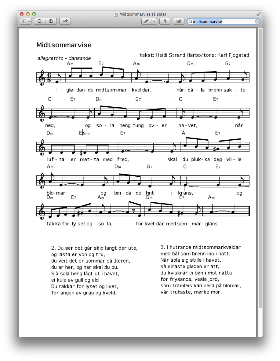 I sommar har eg hatt eit spennande samarbeid med Calle Fjogstad om å få midsommarvisa, som eg skreiv ved St Hans- tider, opp for å dansa. Det gjekk ein del mailar fram og tilbake med forslag og finpussing. Teksten er blitt litt forandra frå den versjonen eg la ut i juni, for at orda skal kunna dansa rytmisk i valsetakt. Calle lova at når han var fornøgd med melodien, så skulle han koma og syngja for meg, og så var det opp til meg å godkjenna. Han tok til og med med seg Georg Pollestad, som hadde fått melodien arrangert for munnspel. Det var eit gildt besøk på ein av dei siste aller varmaste sommardagane. Me sa oss nøgde med det me hadde fått til. Sjølv om me har tenkt å registrera verket på Tono, så var me samde om at nå kunne me dela litt til dei som måtte ha lyst til å høyra, synga eller spela.