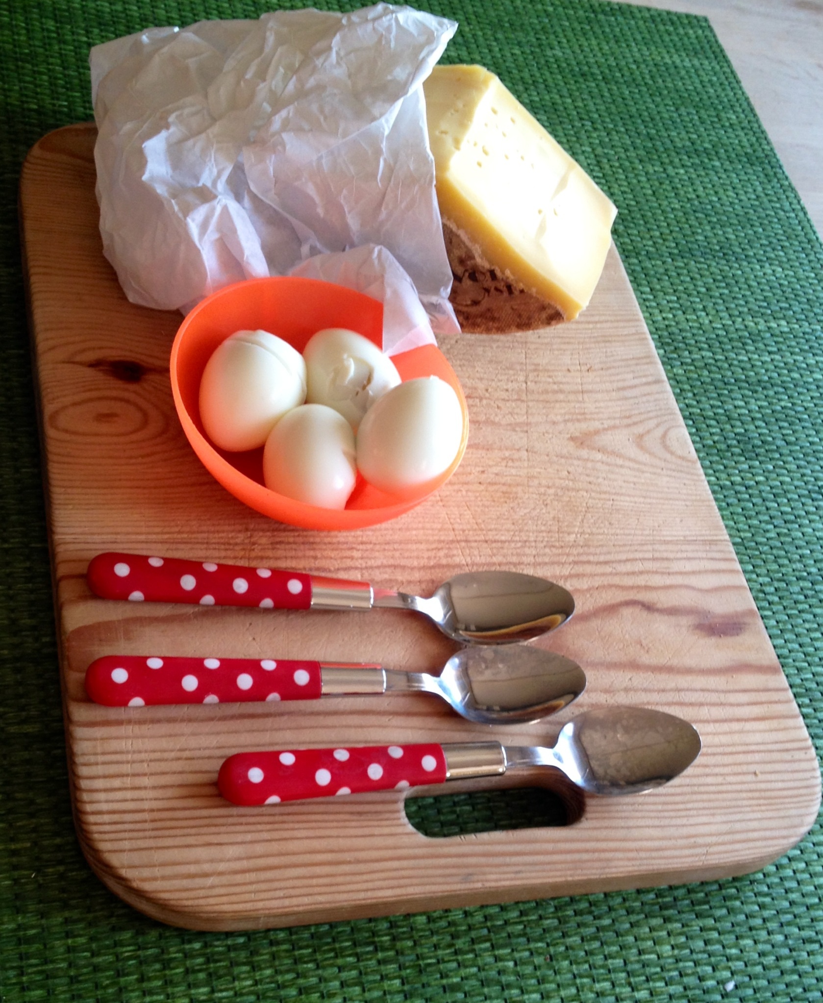 Og Eva serverte varm økologisk tomatsuppe der masse grønsakar hadde hatt ein runde med stavmiksaren saman med tomatar. Servert med kokte egg, jærost, smør og økologisk flatbrød smakte det kjempegodt.