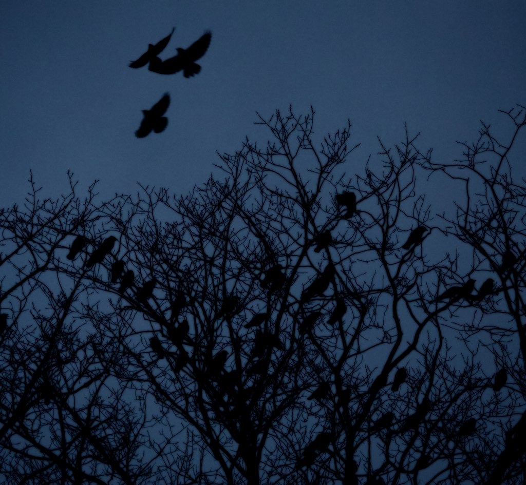 med mørke kroppar, sit det tusen kråker i eit tre.