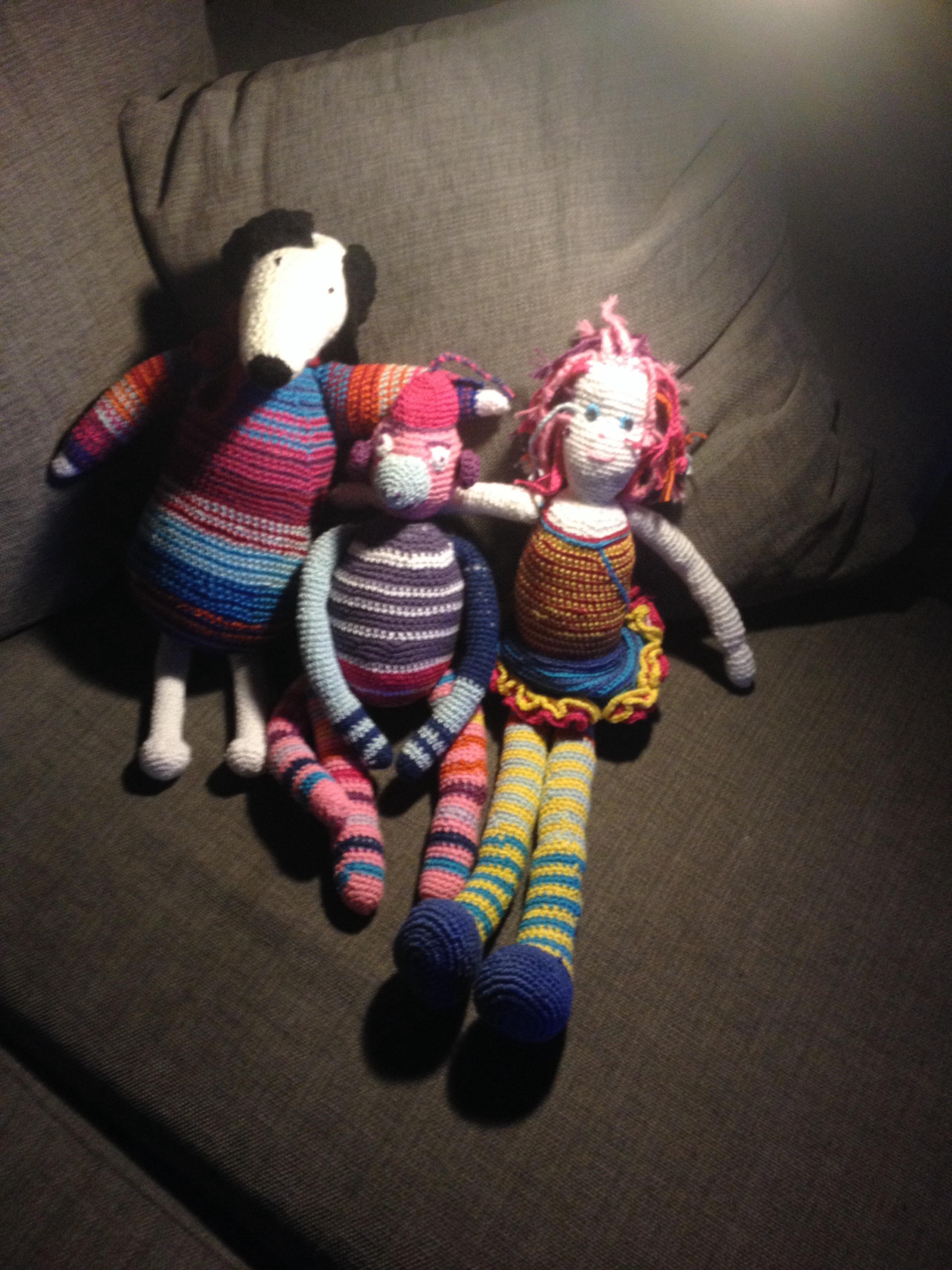 Det er ikkje bare Leif som har hobbyar, mine er ofte hakket barnslegare, det skal seiast. I haust har eg kost meg med å finna opp fargerike heklevesen, og i gårkveld kunne apekatten slutta seg til flokken. Eg finn nok nokon som kan få dei til jul.