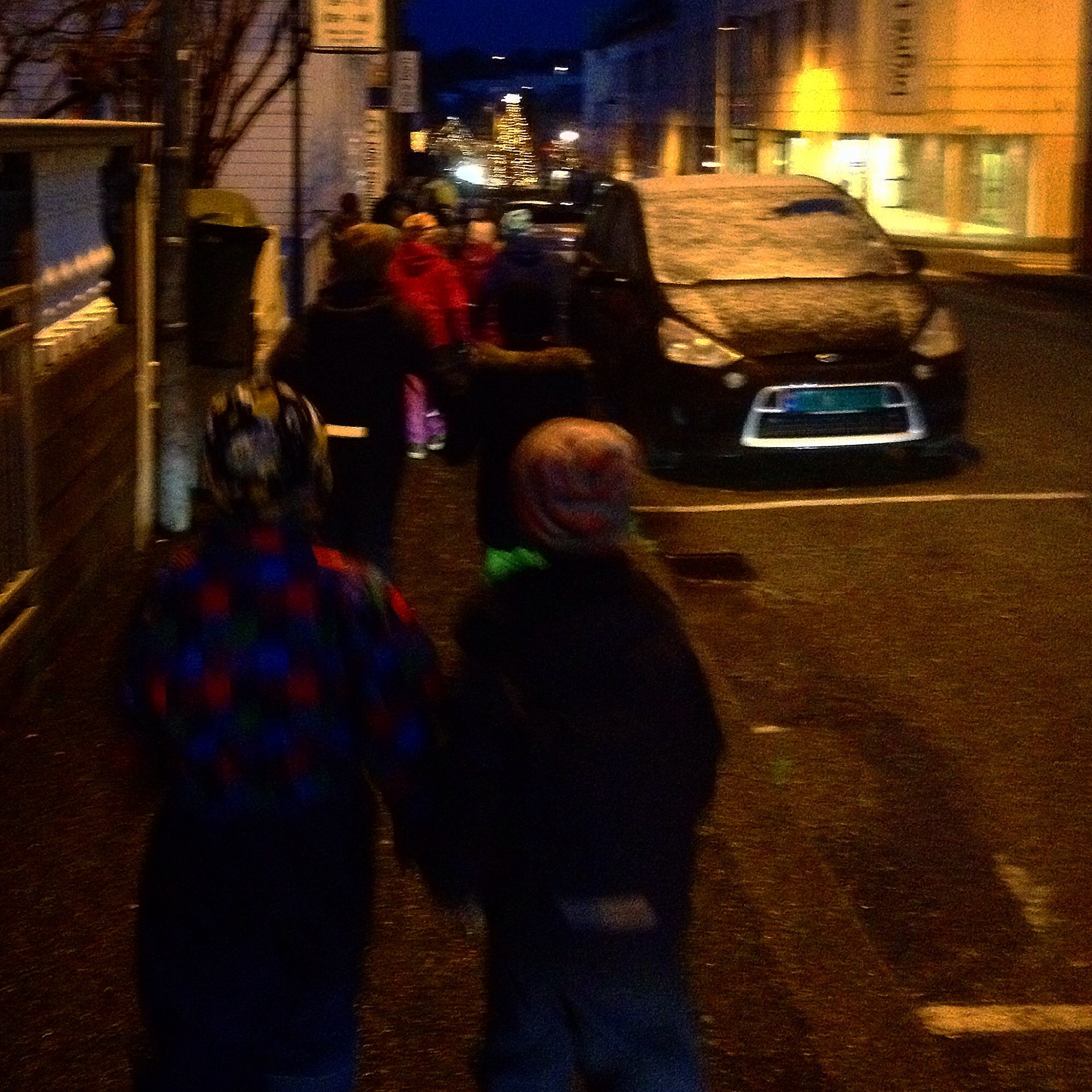 I dag tidleg tok me i mot ungane etterkvart som dei kom og sa at dei ikkje måtte kle av seg yttertøyet. Tvert i mot måtte dei kle på seg dersom dei var tynnkledde, henga ranselen på knaggen og stilla opp ute. Kvart over åtte var det framleis mørkt slik biletet viser. Så stilde me dei opp og gjekk gjennom dei halvmørke gatene ned til torget.