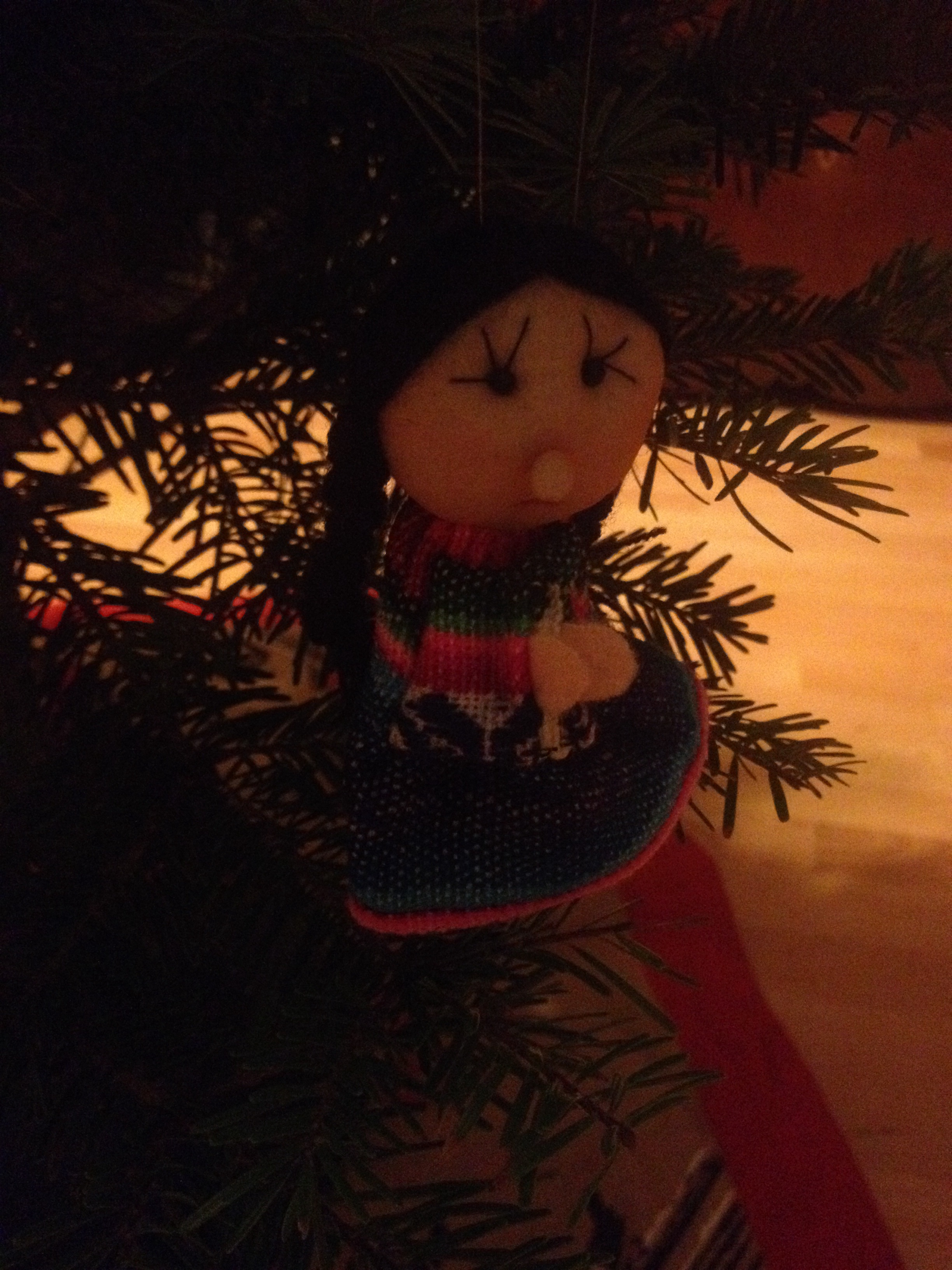 Vel heime var juletreet kome til hus. Halvard sette i gang med stor entusiasme for å prøva å få treet oppi den fantastiske foten me kjøpte for nokre år sidan der treet blir halde på plass av nokre knivaktige greier med ein slags fjørmekanisme. Då eg skulle hjelpa han fekk eg vita at eg bruker neandertaler – metoden, trua på rå muskelbruk framfor refleksjon og teknisk analyse. Det kan han kanskje ha rett i… Men faktisk var det rå muskelbruk som skulle til i dag, nå står treet fanga i saksa. Merkeleg nok lyste alle lysa og, det skjer langt frå kvart år, men kanskje var det ein matematisk lov som gjorde at seinsommar har brukt tjue minutt eller meir på å få treet i foten skal sleppa dei lange rundene med å møysommelig sjekka ut ei og ei lyspære for å sjå om me fekk lys. Eg hengde på fire bolivianske juleenglar som Sunniva kjøpte til meg då ho var med på julemessa til misjonsalliansen for eit par veker sidan. Resten av pynter får hengjast på i morgon…