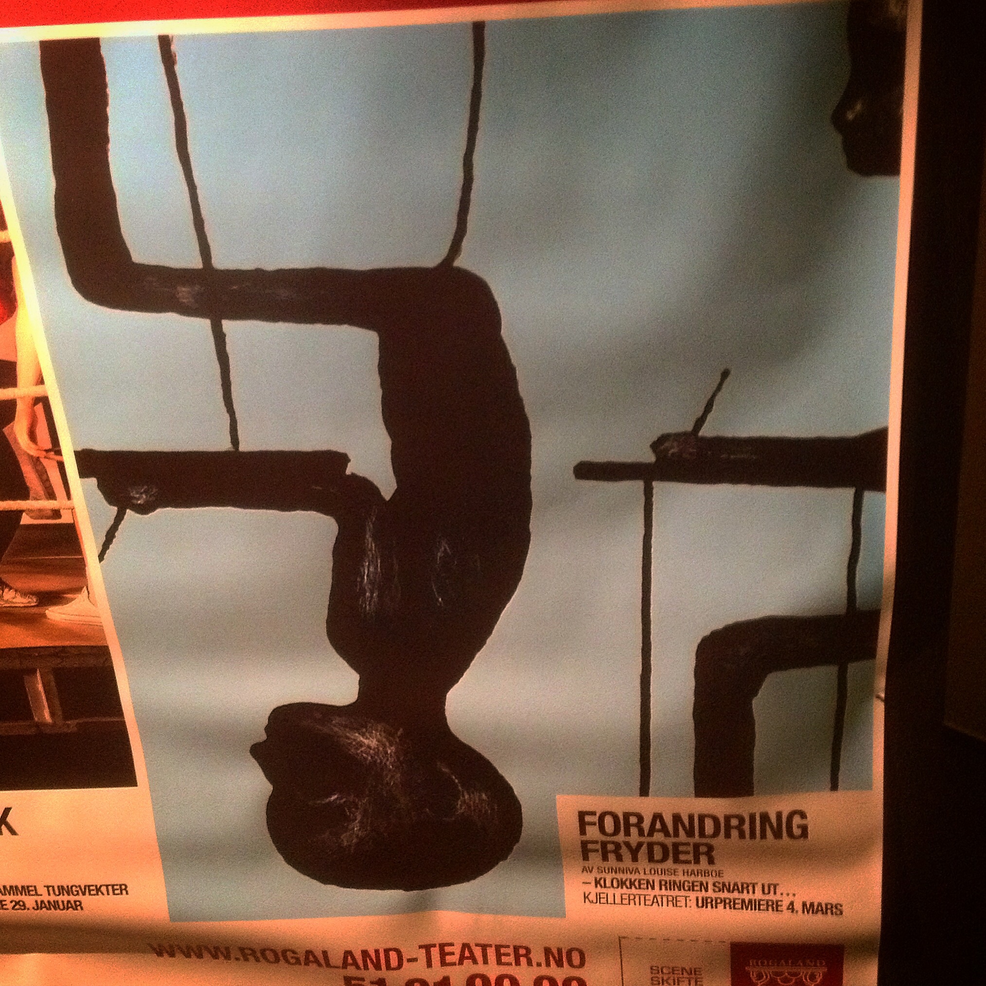 Eller «Forandring frydar», som det heitte i Sunniva sitt nynorske originalmanus. Tidleg tysdag kveld henta me Sunniva på flyplassen. Ho kom rett i frå praksisklasseromet der aust ein plass. Eg hadde stressa litt med at me kunne bli for seine til premieren dersom flyet var meir enn litt forsinka, men heldigvis ende me opp med å få god tid, og Sunniva kunne troppa opp på Stavangerpremieren med syster, bror, svoger og mor på slep. I den vesle foajeen på kjellerteateret venta det oss ein skjerm med denne påskrifta, og med bilete frå forestillinga.