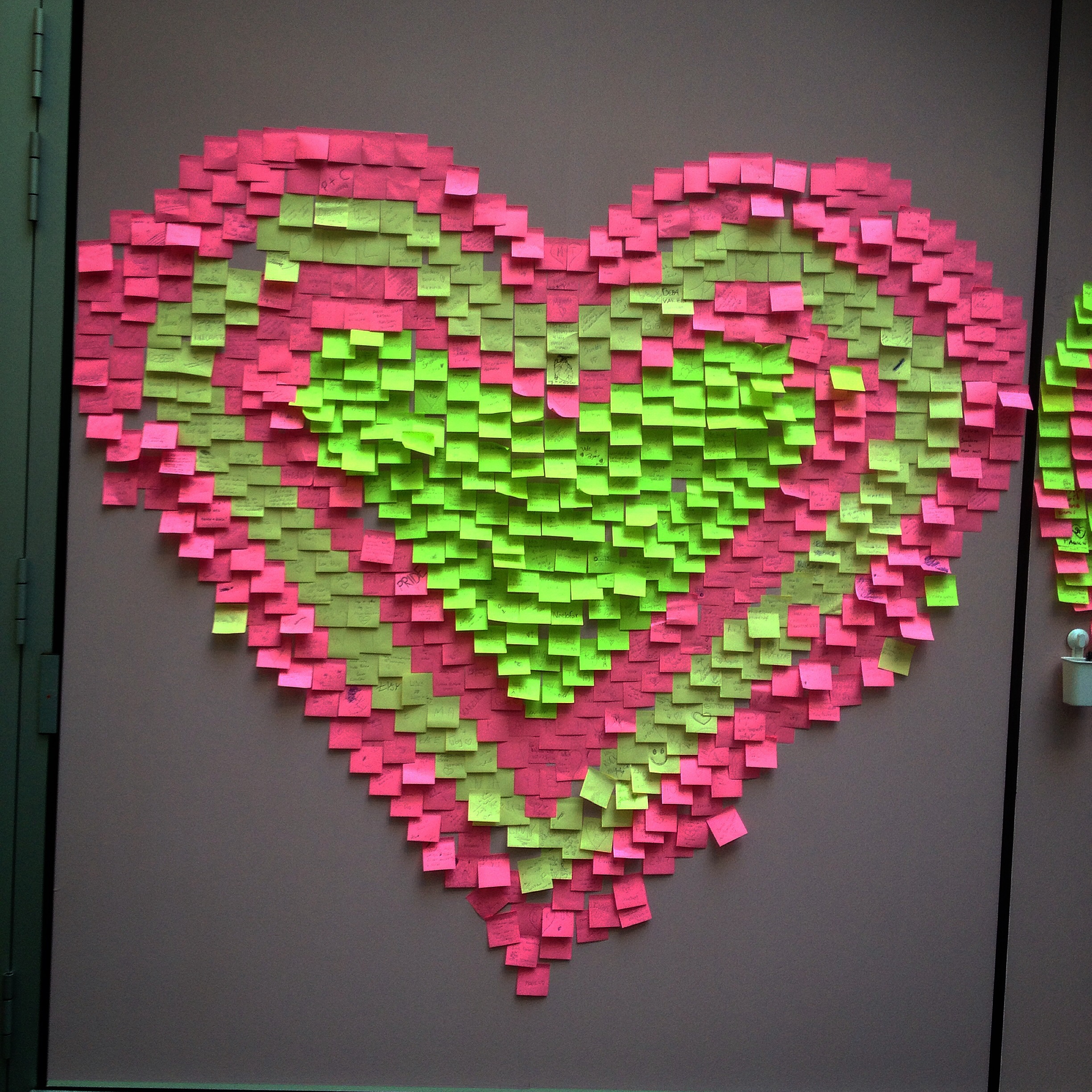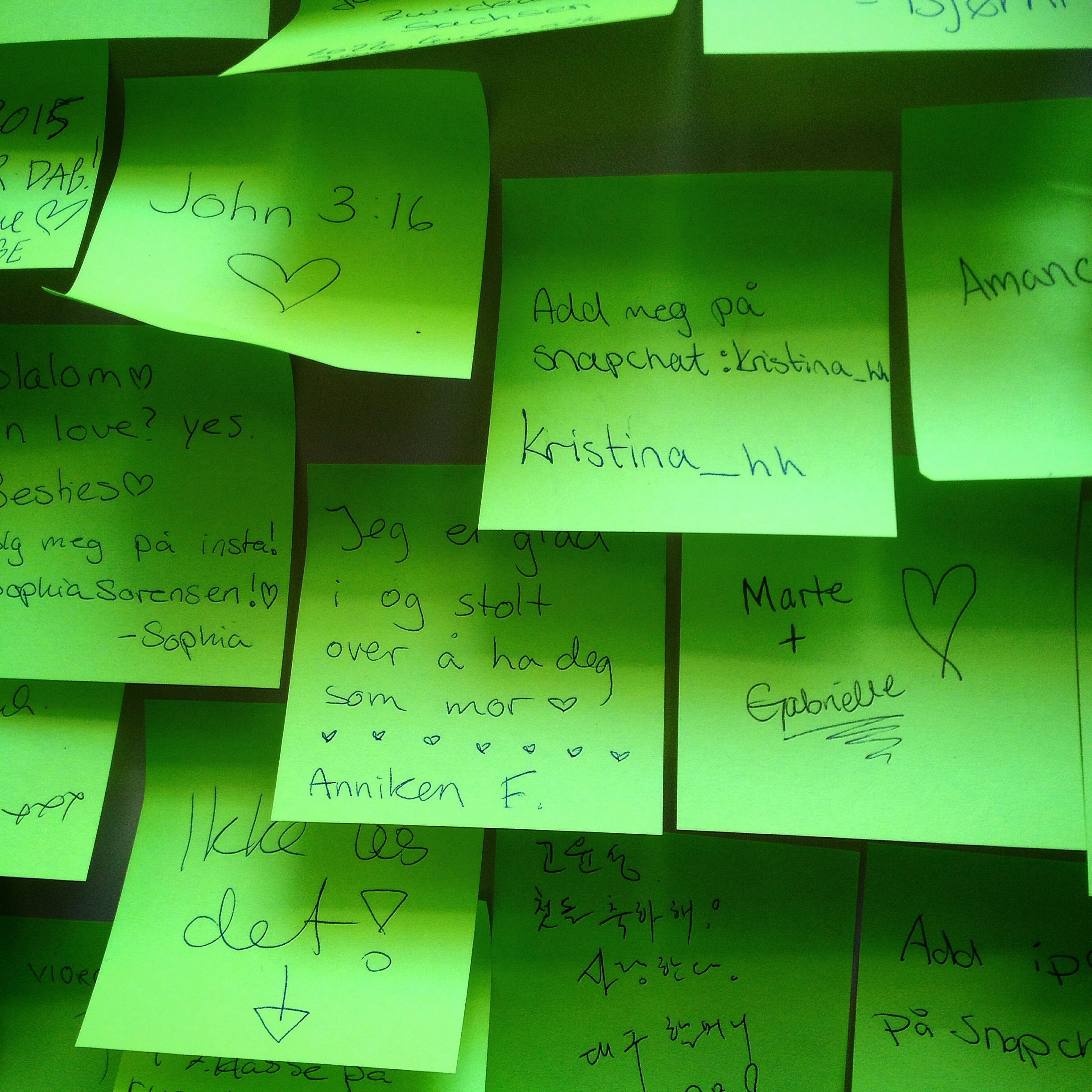 I eit bygg like i nærleiken hadde publikum blitt inviterte til å skriva små brev på post-it-lappar som så vart monterte opp som store hjarte. Dette var ein enkel og spennande ide ein må kunna stela med seg.