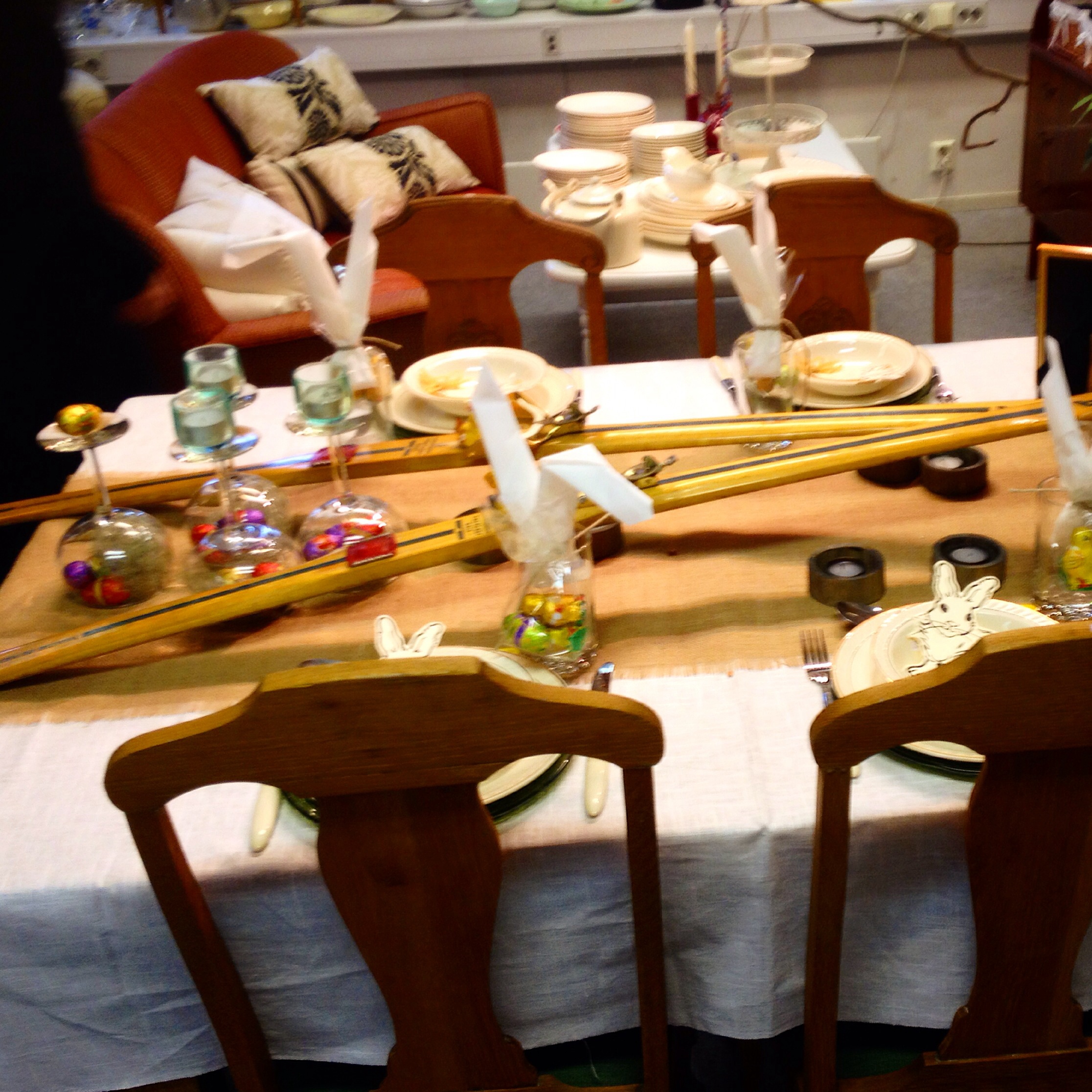 På fredag fekk eg jammen kjøpt meg kongeblå kjole til Ingrid sitt bryllaup. Med Eva Mari som personleg shopping-assistent, så fekk han jammen fylgje av diverse andre klesplagg i handleposen. Ho snor seg fram mellom reolane og set blikket på plagg eg aldri ville hatt fantasi til å koma på å prøva. Denne gongen fekk eg med meg fylgjande visdomsord på vegen vidare av mi kjære svigerinne: » Det er greitt nok å trenga ein stor størrelse, men kleda treng ikkje å sjå ut som om dei er plukka ned frå klessnora til ein nabo som er tre størrelsar større enn deg!» Dama kan få sagt det. I løpet av helga har me og samla på gode tips for dekking av påskebord: