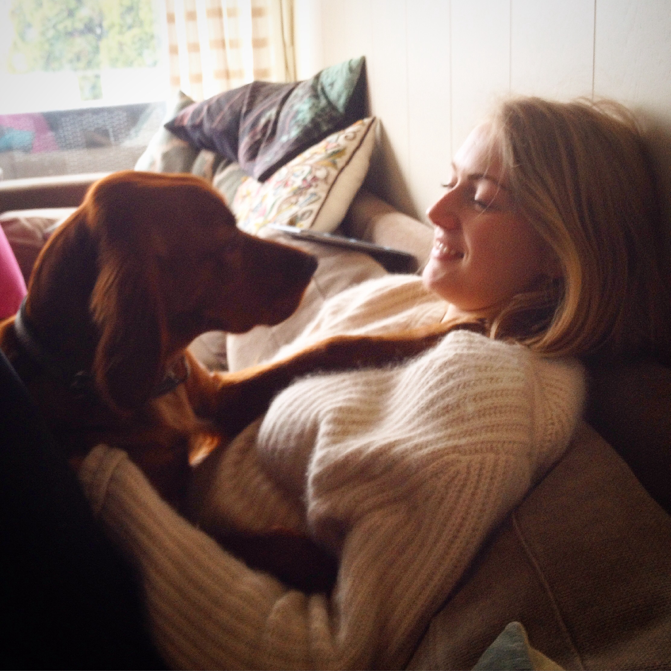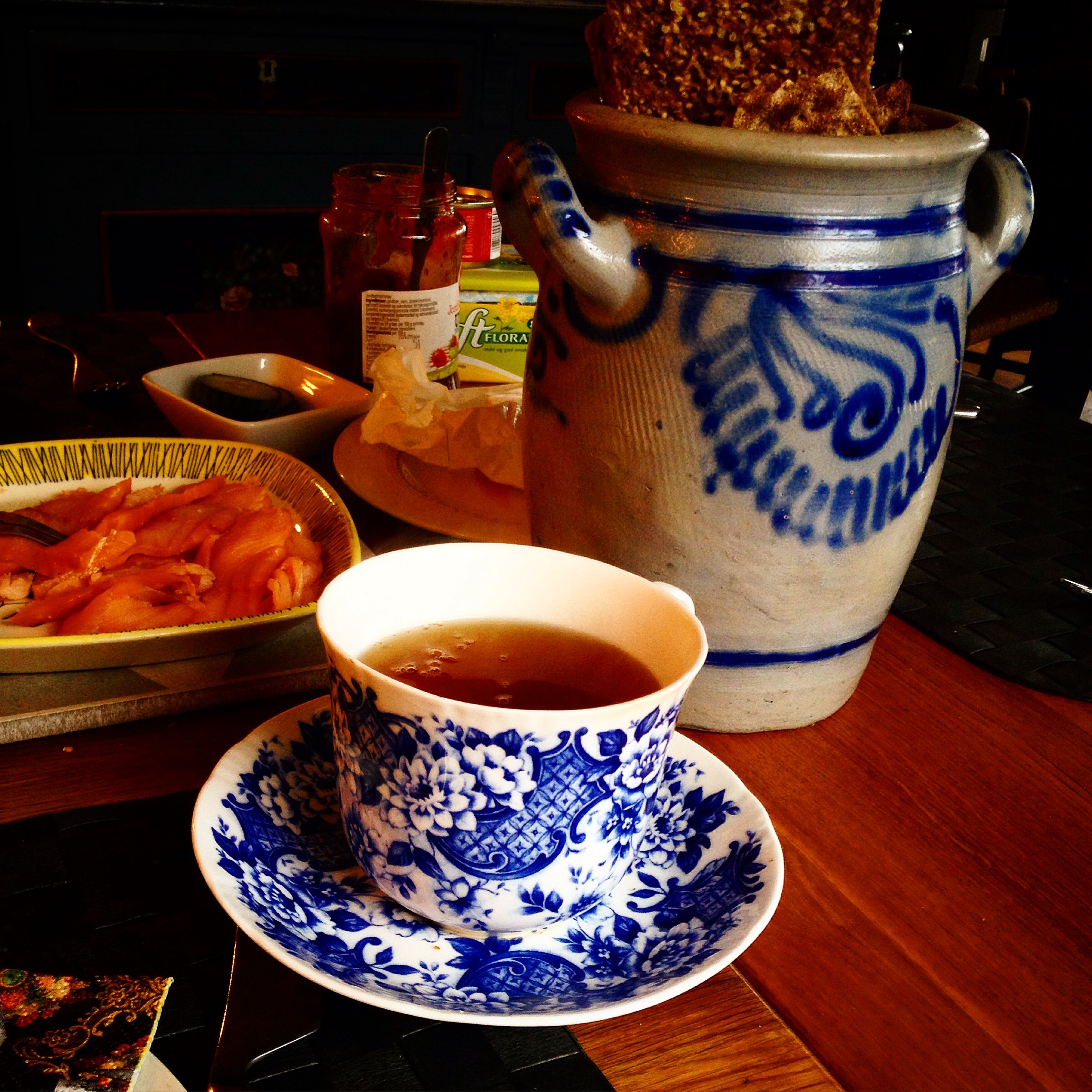… for den siste veka har eg vore for travel til å ta ho fram, men nå opnar tida seg. Eg fortalde litt om den fine helga i Oslo/ Bærum, og nå har eg lyst til å visa fram litt meir. Eva Mari har arva desse fine tekoppane etter vår felles svigermor, og på sundag fekk eg servert morgonte i dei og luksusknekkebrød frå ei matchande krukke. Med eggerøre og heimerøykt og heimefiska laks frå Sunnmøre, så vart det eit herremåltid for damer. Ikkje lenge etterpå kom Sunniva bort for å vera i lag med oss, og så vart det servert nysteikte vafler. Hunden Lara har verkeleg lagt sin elsk på både Sunniva og meg. Sunniva fekk ikkje fred eit sekund, men kven kan stå i mot ein valpeyr irsk setter?