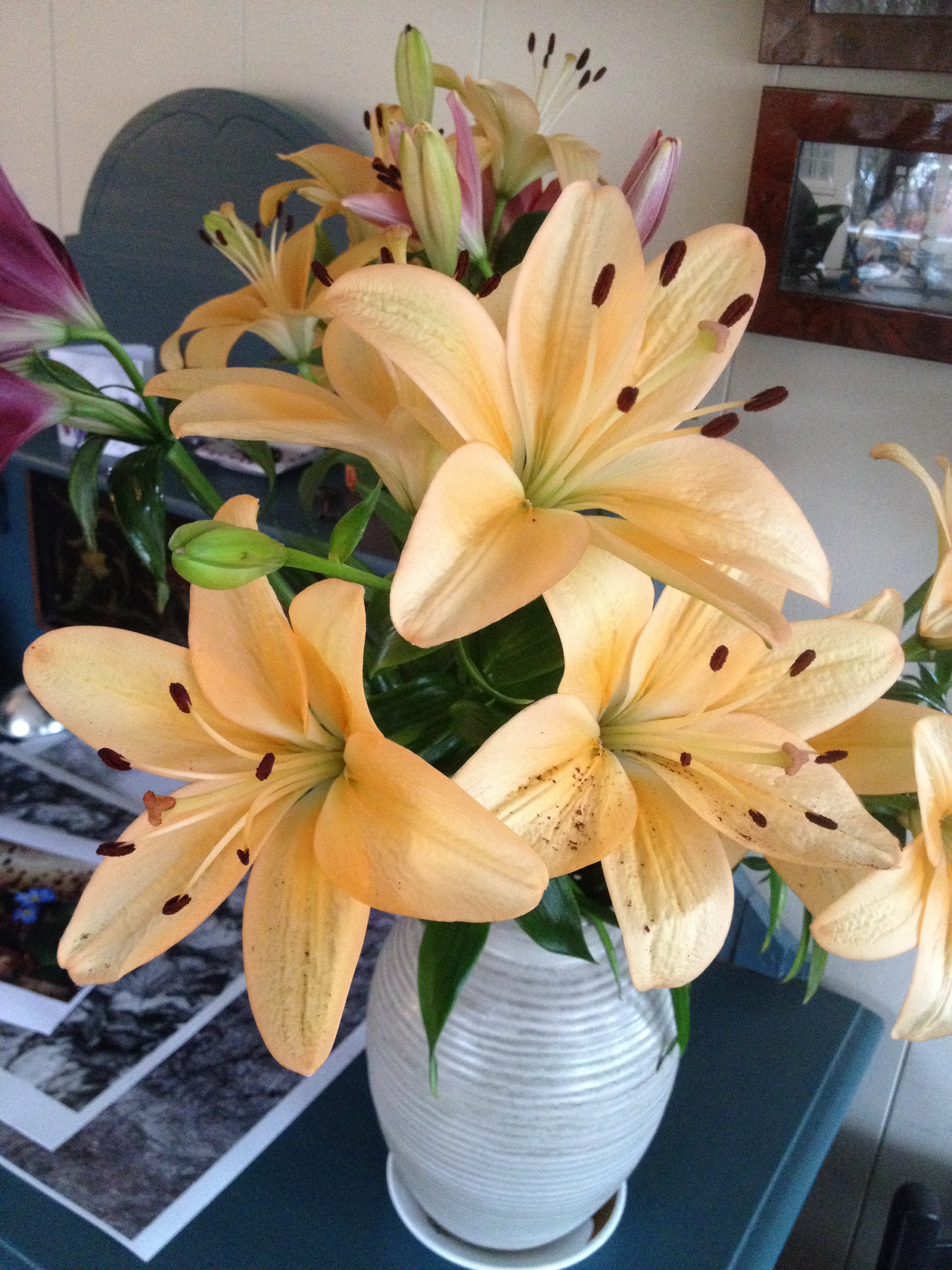 Eva Mari hadde så fine liljer i stova. Seinare på dagen gjekk me på tur og fann blåveis, men då hadde eg lagt att mobilen i bilen deira, så eg fekk ikkje fotografert desse flotte blomane som er ei eksotisk openbaring for oss vestlendingar.